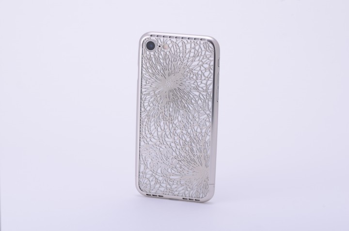 側面の勘合部は宮大工の継手を参考にしています。iPhoneの四隅のラウンド部にぴったり沿うようにプレスされたフレームは、100年の歴史を持つ大島金属工業の匠の技が活きています。スピーカー部分の穴は、NASAやJAXAの部材加工を手がけるモルファが0.01mm精度で切削加工し、加工後には目に見えない小さなキズや汚れをひとつひとつ丁寧に、手作業で取り除きます。最後のバフがけは、バフがけ一筋30年の薩摩技研の職人が、荒取り、磨き、鏡面仕上げという3つの工程で磨き上げ、なめらかで優しい手触りに仕上げられているんです。