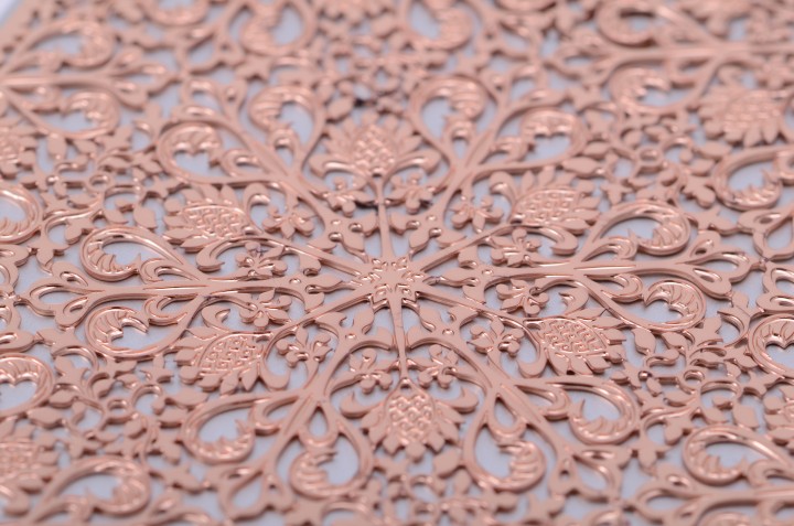 イスラム教の教理の中で育まれた、草木花柄の至高と言われるアラベスク柄。長い時間をかけ、対称性に富んだ独特の文様は息をのむ美しさです。