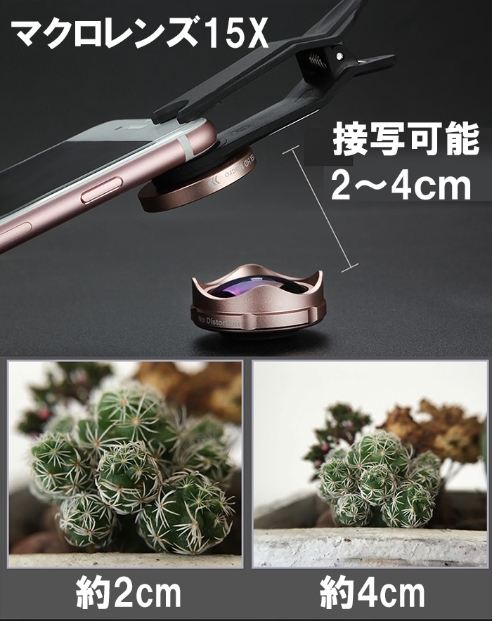 ワイドレンズの部分を取り外せば、被写体に2cm~4cmの距離まで近づいて撮影できる、マクロレンズとしても使用可能に。料理をアップで写したり、きれいな花やアクセサリーを写したい時に活躍します。