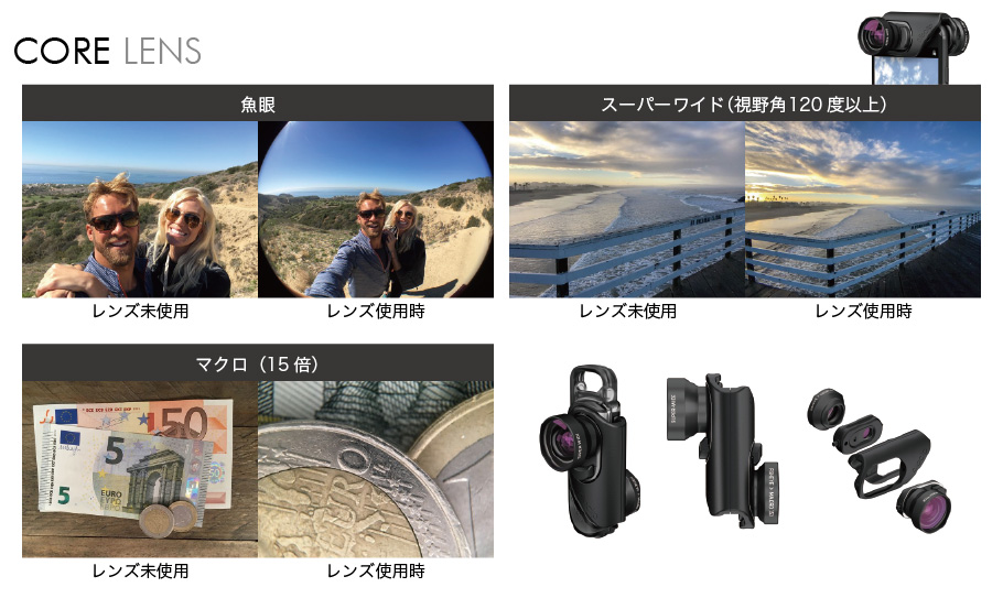 「Core Lens for iPhone 7/7 Plus(1万1600円)」は180度の視野角を湾曲させた画像を撮影できる魚眼、120度の視野角を収めるスーパーワイド、至近距離からの接写が可能なマクロ15倍の、3種類のレンズを搭載。