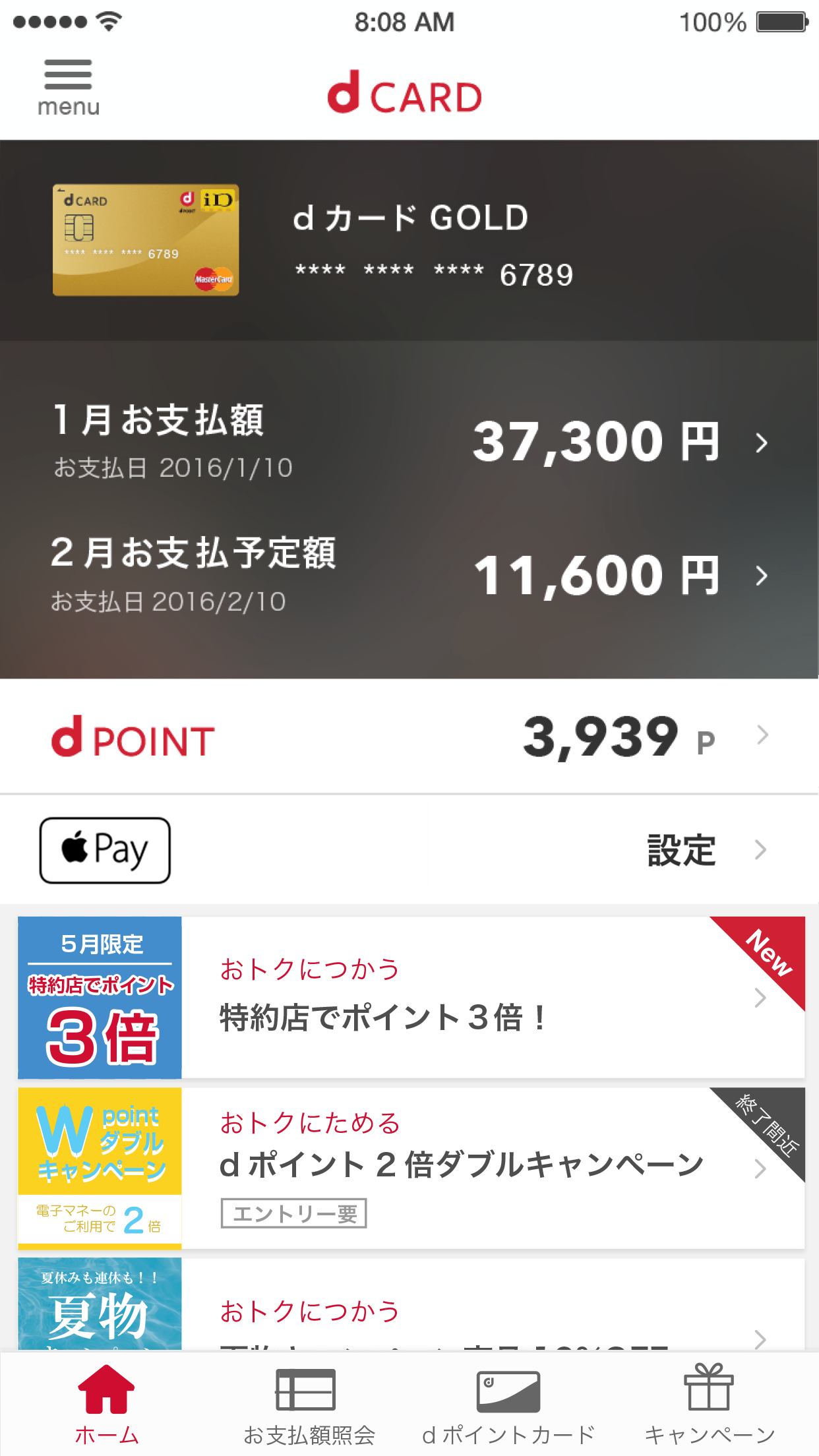 そんな中、今年の11月からApplePayの対応を開始したNTTドコモの「dカード」では、コンビニ割引などの特典が。ローソン、マクドナルド、ノジマで買い物をした場合に3%割引のサービスが受けられます。よく使うコンビニやファーストフードだからこそ、チリツモの効果は大きそう!