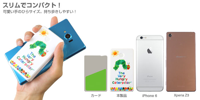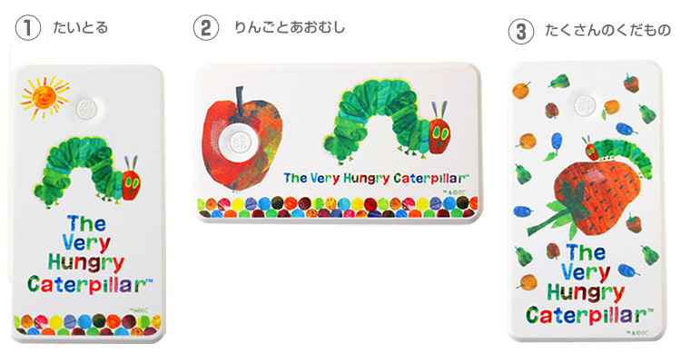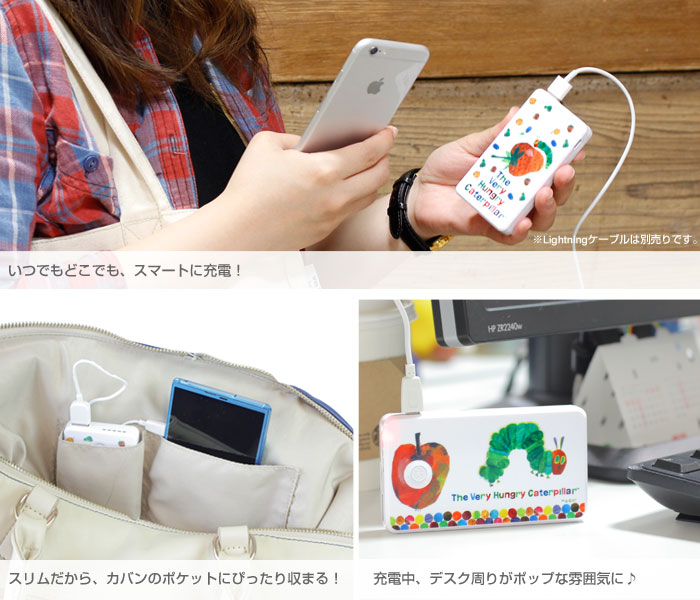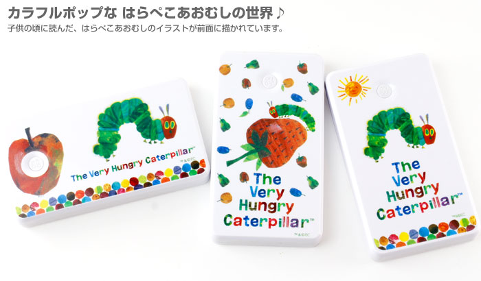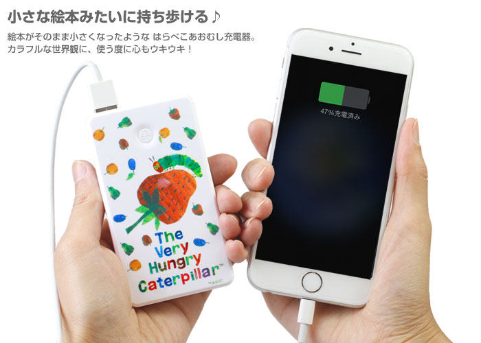 スマホのバッテリーはブラックやシルバーなどのシンプルなデザインのものが多いが、このバッテリーはまさに「はらぺこあおむし」のカラフルな世界観そのままのデザイン。「たいとる」「りんごとあおむし」「たくさんのくだもの」の3種類あり、どれを選ぶか悩むんでしまうかわいらしさだ。