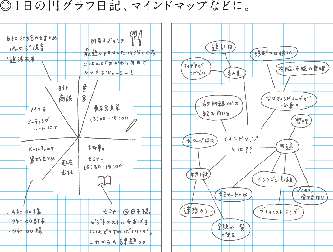 中央に空白の円があり、周囲が方眼になっているタイプ。マインドマップや、中央の余白部分を時計に見立てて円グラフ日記にしてもOK。午前・午後で1ページずつ使って、明日のスケジュールを書き込めば手帳のように使えて仕事が捗りそう。