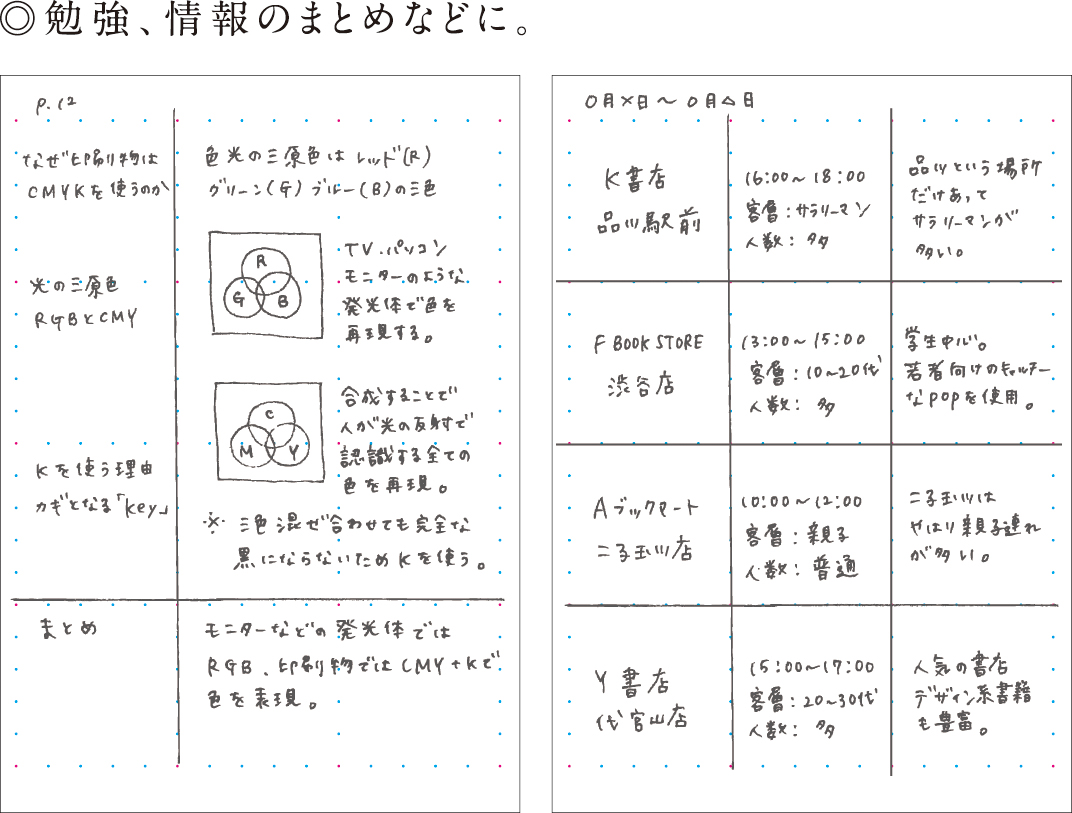 点をつなぐと1ページを最大12分割できるので、点の結び方次第でいろんなレイアウトに変化します。学習用や情報のまとめ用ノートとしてはもちろん、フリーハンドで線が引きやすいので、資料のレイアウトを考える時の下書きなどにもぴったり。12分割して日付と予定を書き込めばカレンダーとしても使えそう。