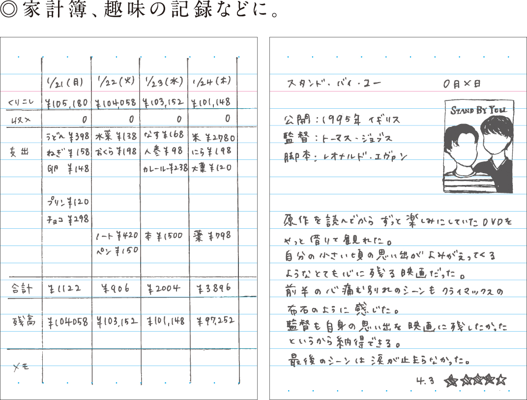 基本は横罫ですが、1本だけ赤線になっているタイプ。そのまま学習ノートとして使うもよし、縦線を引いて家計簿にしたり、映画やお料理といった趣味の記録としても。