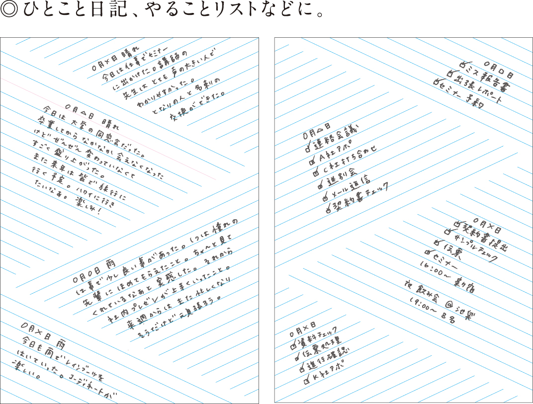斜めの罫線が1ページに複数入ったタイプ。ひとこと日記ややることリスト、電話の際のメモなど、ちょっと書き留めておきたいときに使いたいノートです。小さいメモに書いてメモごと失くしてしまいがちな人にはぴったりかも。