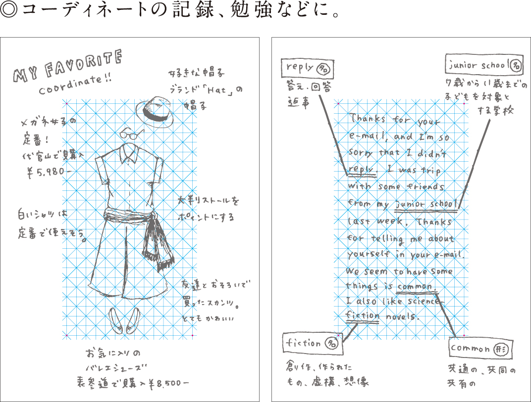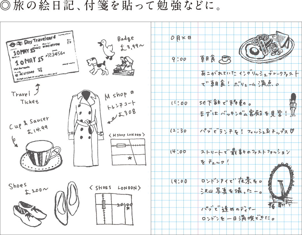 見開きで左ページが無罫、右ページが方眼になっています。旅の絵日記はもちろん、付箋や切り抜きを貼ってスクラップ帳としても活用できそう。写真を貼ればちょっとしたアルバムとしても使えそうですね。