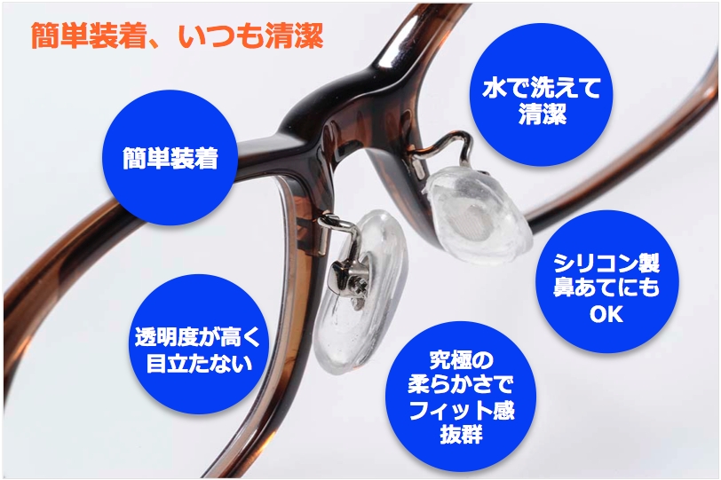 このアイテムの特長は、その柔らかさ。シリコンの硬度は他社品の1/10以下で、オフィスでのパソコン操作や旅行やドライブなどで長時間使用しても痛みを軽減してくれます。鼻にフィットするので、激しく動くスポーツ時にもクッションとして活用できるうえ、汗や皮膚の油脂で汚れたら、簡単にはずして水洗いできるので衛生的です。