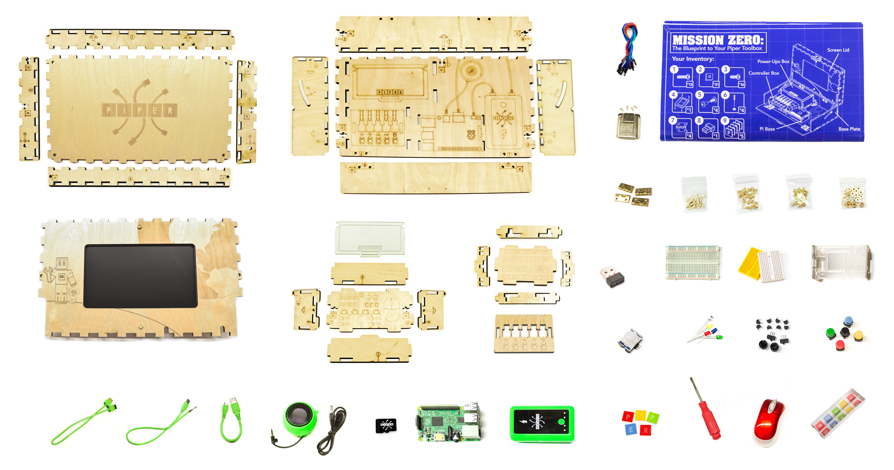 メインシステムはRaspberry Pi 3。その他7インチの液晶モニタやバッテリー、スピーカー、マウスなど、必要なパーツはすべて付属しているので、手にしたその日からすぐに使えます。ウッドパネルセットはツールボックスになるので、必要なものをすべてひとつにまとめてしまっておけるのもうれしいですね。