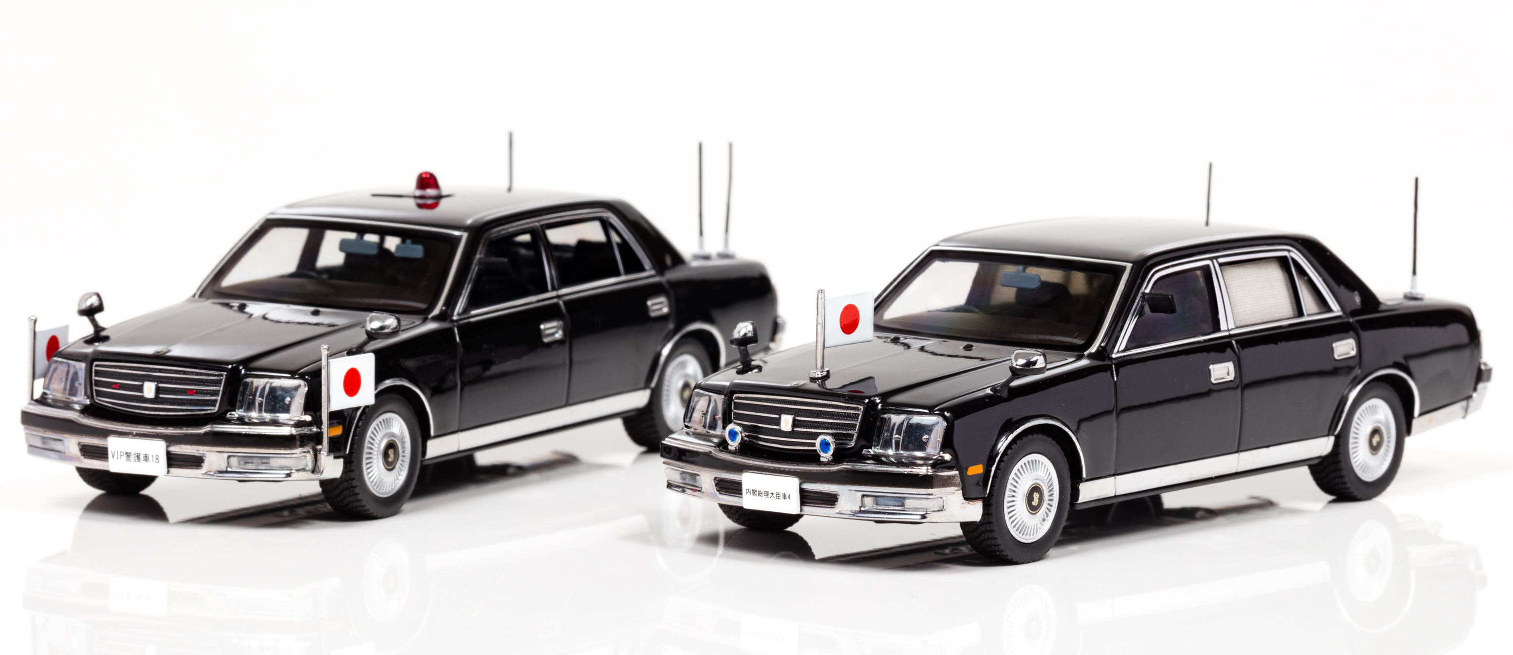 今回販売するトヨタ センチュリーは、「内閣総理大臣専用車(GZG50)」とそれを警護する「警察本部警備部要人警護車両(H743SE01)」に使用されており、その2台が国旗を掲揚した状態をモデル化。500セット限定で、実際の仕様を忠実に再現しています。
