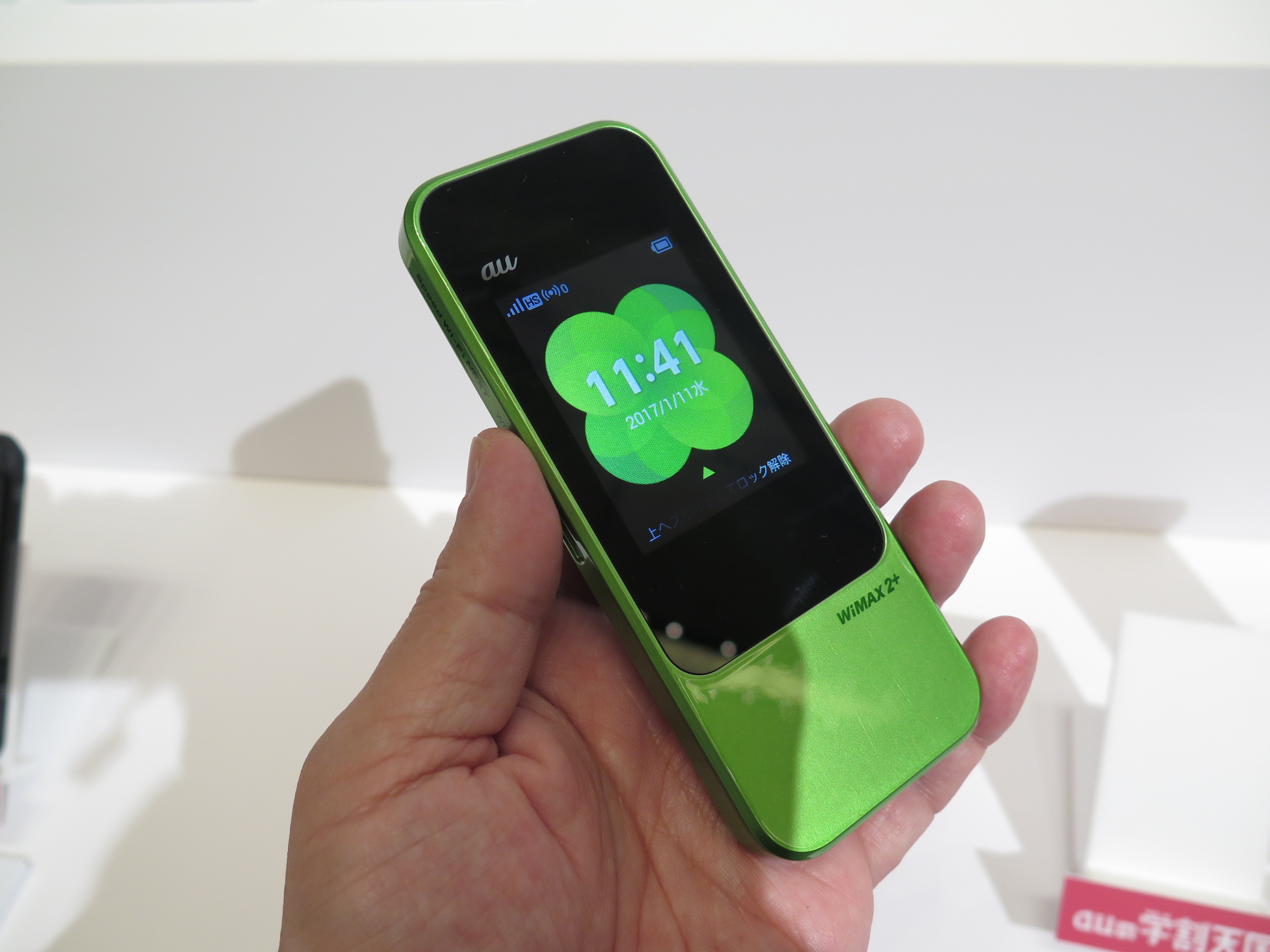 モバイルWi-Fiルーター「Speed Wi-Fi NEXT」は、実質負担金は0円で、2月中旬発売予定。従来のルーターとは一線を画する縦型デザインを採用し、スマホのように片手で操作しやすいことが特徴。Bluetoothでのテザリングにも対応し、Wi-Fi接続時に比べると通信速度は落ちるものの、バッテリー消費を抑えることができることが特徴です。別売のクレードルは有線LANポートを備え、自宅用のルーターとして使うこともできます。