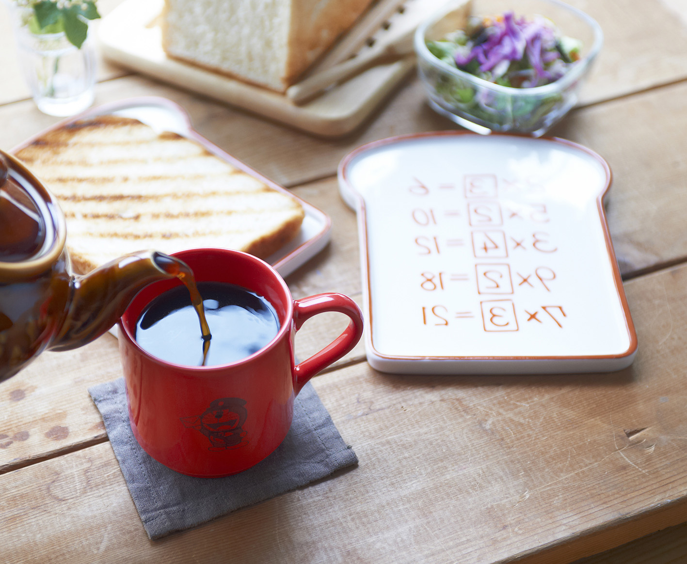 アンキパンとは、暗記事項をノートなどからパンに複写してそのパンを食べると暗記が完了、というひみつ道具。テスト前に「アンキパンが欲しい!」と思った人、たくさんいますよね。今回登場するのは九九がプリントされたパン型の皿。この上にパンを乗せて食べたら九九が覚えられる…!?マグカップもついています。