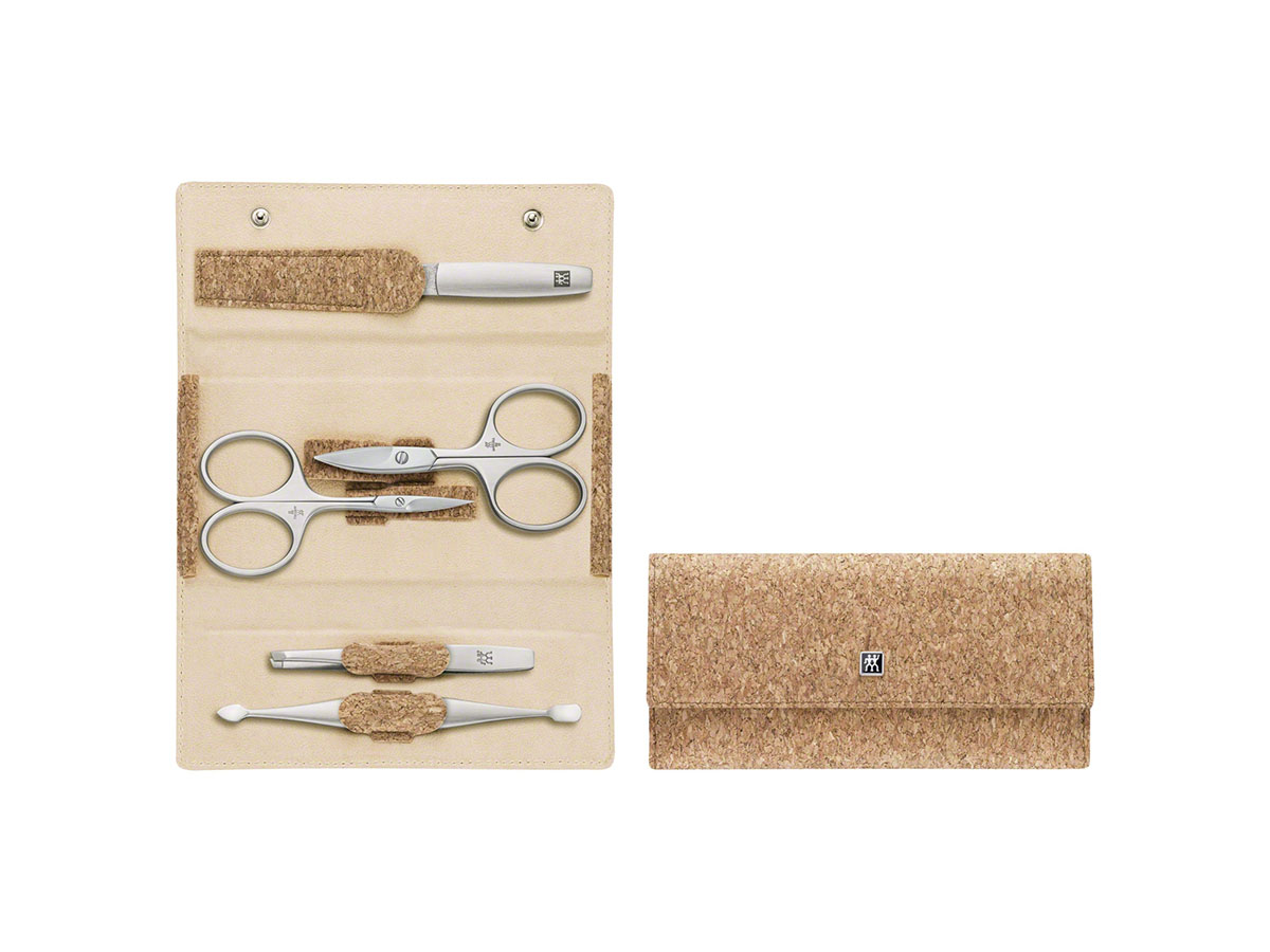 ▲「TWINOX コルクケース 5pcs セット」(3万7800円) 上から①ネイルファイル(爪用のやすり)②ネイルシザー(爪用ハサミ)③キューティクルシザー(甘皮用ハサミ)④ツイーザー(毛抜き)⑤スクレーパークリーナー(爪と指の間に入ったゴミの除去と、甘皮を押し上げる機能を兼ね備えたモノ)