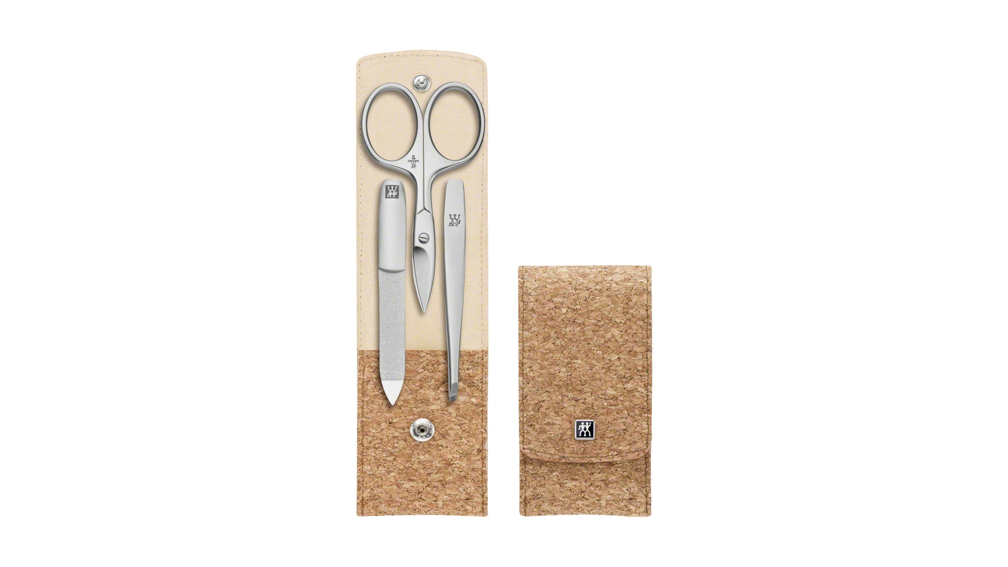 ▲「TWINOX コルクケース 3pcsセット(2万1600円)」 左から①ネイルファイル②コンビネーションシザー(キューティクルシザーとネイルシザーの両方の機能を兼ね備えたハサミ)③ツイーザー