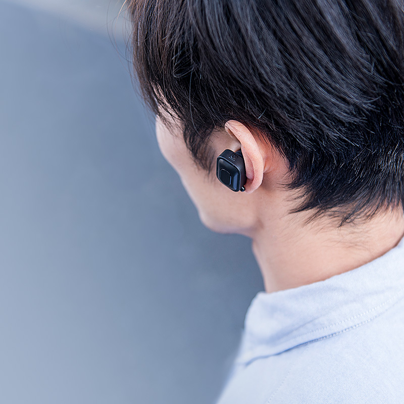 ▲イヤーフックが耳の内側にフィットしズレを防ぎ、 安定した装着感を得られます