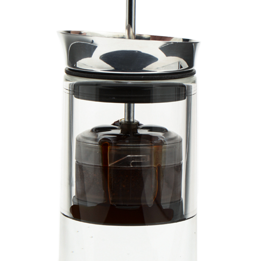 手でゆっくりプレスしていくと、カラフェの中でお湯が消え、どんどんコーヒーが湧き出てくる。淹れる過程がビジュアル的にも楽しいのはポイントが高い!