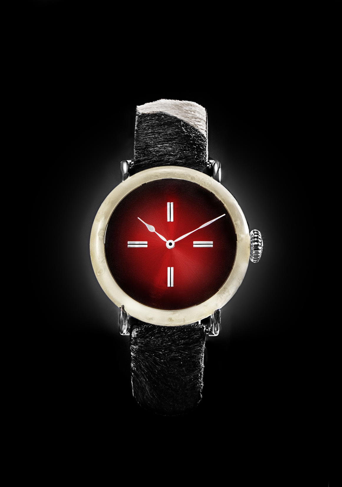 特製ケースは、 金賞受賞の本物のスイスのチーズ「ヴァシュラン モン ドール」を基礎材料として作られています。これを革新的な複合材料 itr2(C) に追加してから、 機械加工と研磨を施し、 モーザーのサインを添えて仕上げられます。日常食材がプロダクトになるなんて、ちょっと驚きですね。