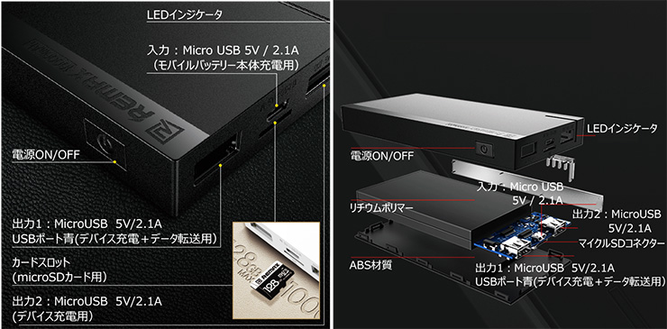 カードリーダー機能は、最大128GBまでのマイクロSDカード(別売り)に対応。iPhone用とAndroid用スマホに対応した専用アプリを用意しており、双方向データの転送・読み出しができます。