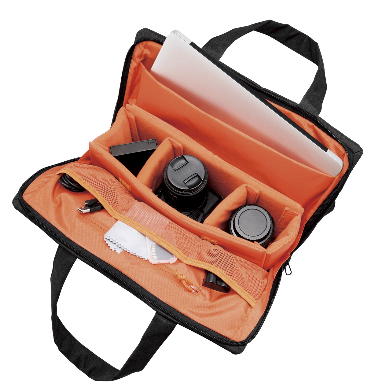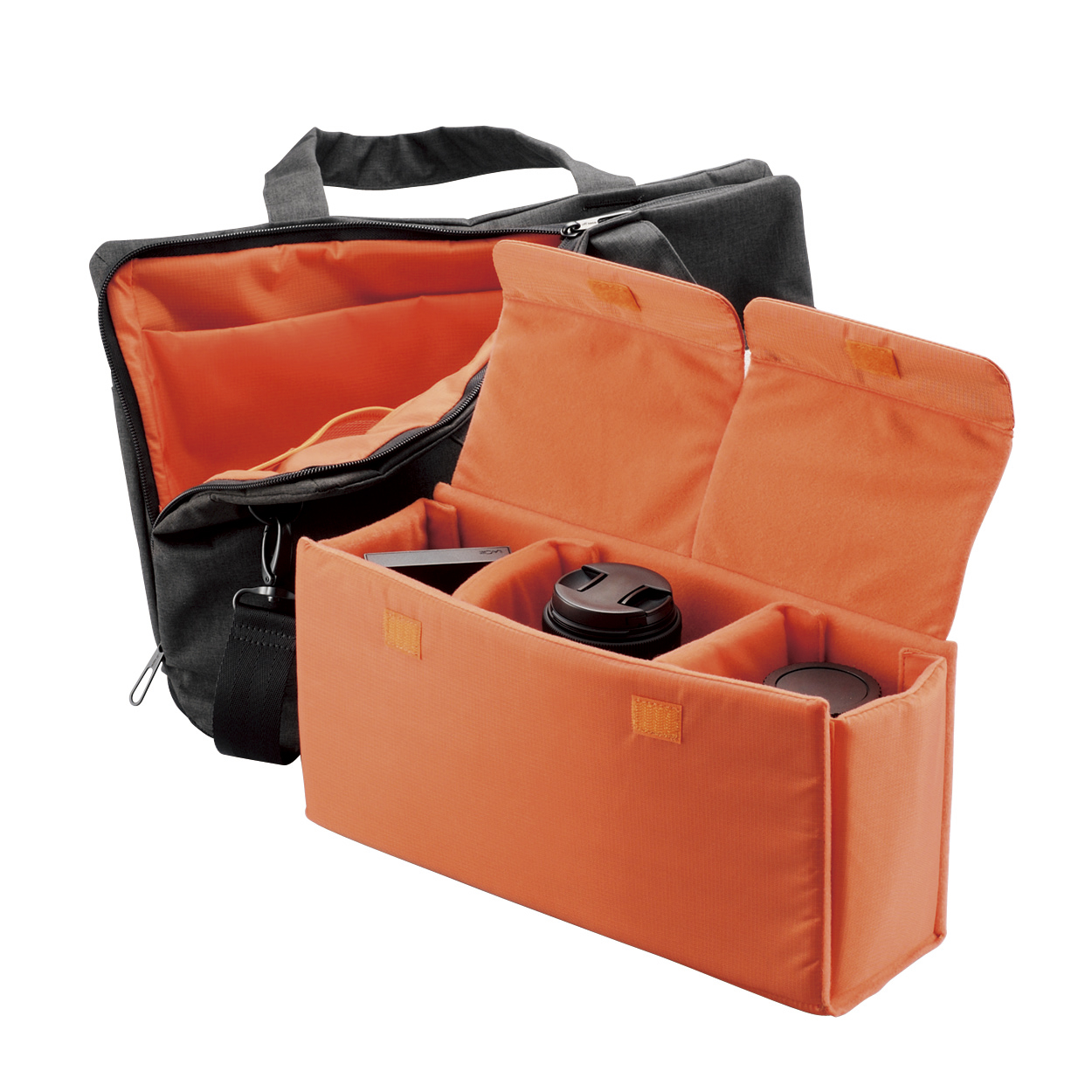 バッグの中には、開閉が可能な2分割のフタや、好みのサイズに調整できる仕切り板が付属したカメラインナーケースが。また、小物を入れるポケットも充実。内側、外側にさまざまな小物類を収納できるのはもちろん、13.3インチまでのパソコンが収納できるポケットまでも装備しています。