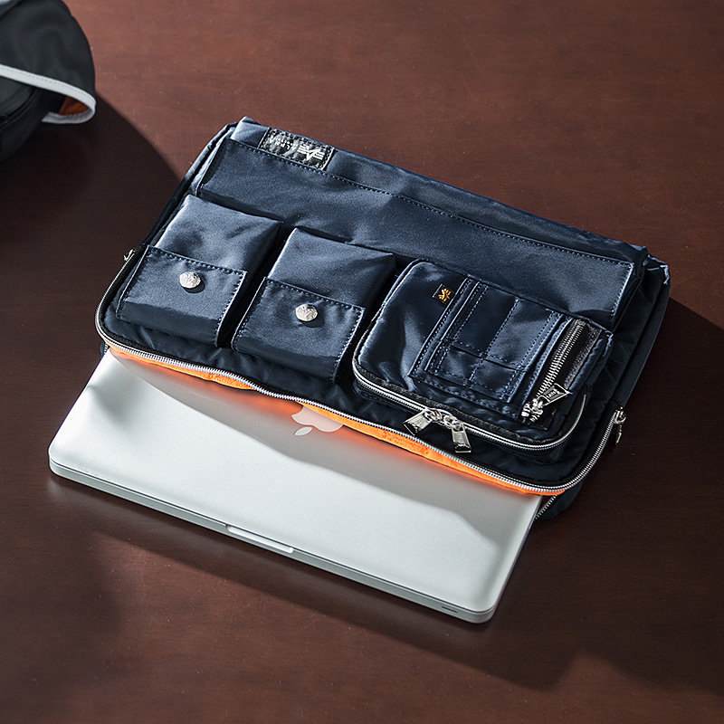 サンワサプライから登場した「200-IN048_049シリーズ」。MA-1の代表格ともいえるアルファ製ジャケットと同じ生地を用いたPCバッグです。やわらかい手触りと光沢はまさにMA-1! 撥水加工が施され、耐久性にも優れています。 内側がオレンジというのもいいですね。