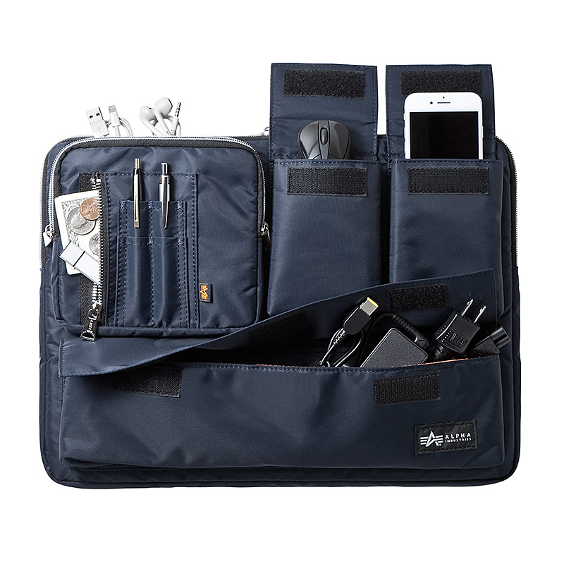 注目したいのは機能面。前面に6つものポケットを搭載しているので、ACアダプタやマウス、スマホなどの周辺機器をすっきりと収納できます。さらに持ち運びに便利な取っ手もついています。