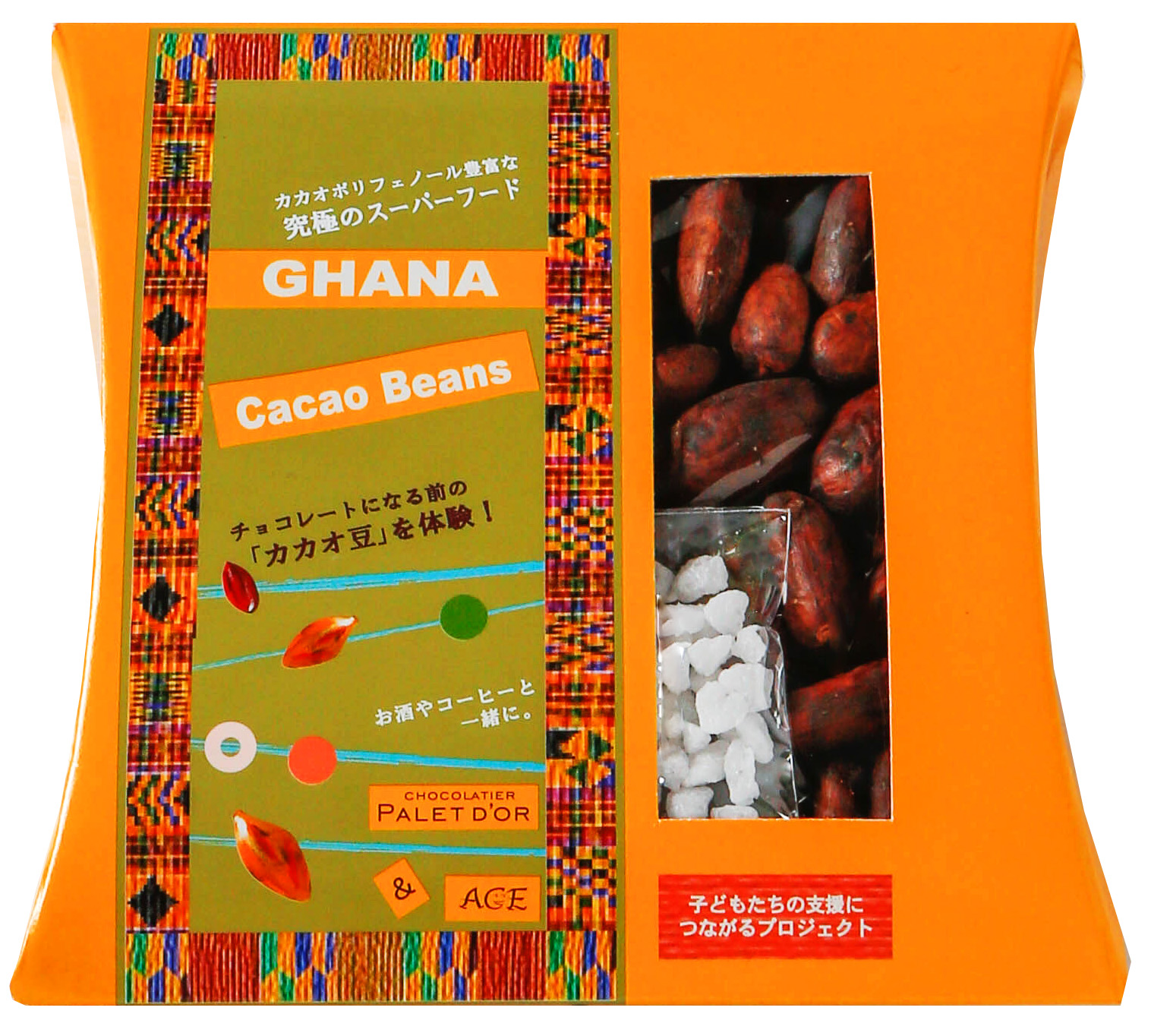 食べる人の体だけでなく心にも、そしてガーナのカカオ農家とその子どもたちにも優しい「ガーナスマイルカカオプレミアム カカオビーンズ」。別添袋の砂糖5gを含む50g入りで、価格は734円です。