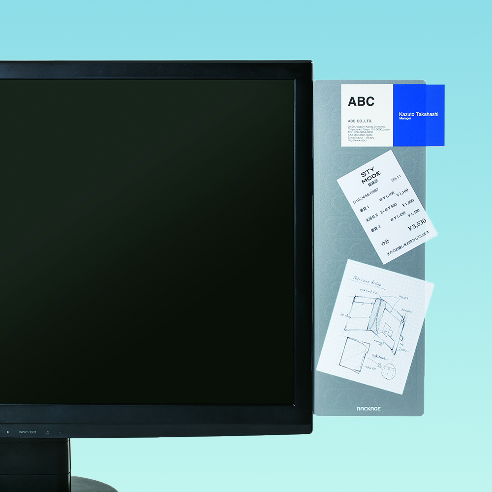 前モデル「ラッケージ」RK10 と比べ、新モデル「ラッケージ」RK20 は、横幅が約10cmコンパクトに。スペースを取らず、デッドスペースの活用にピッタリです。同時発売の「ラッケージ」専用取り付けアーム を使用すれば、PCモニターの横に設置できます。本体背面にはマグネットが内蔵されているので、鉄製の間仕切りにも取り付け可能。ただし、複数枚の紙を重ねて貼り付けることはできません。
