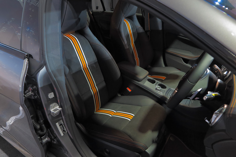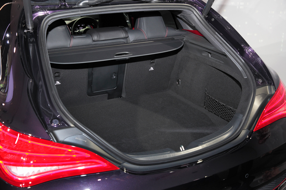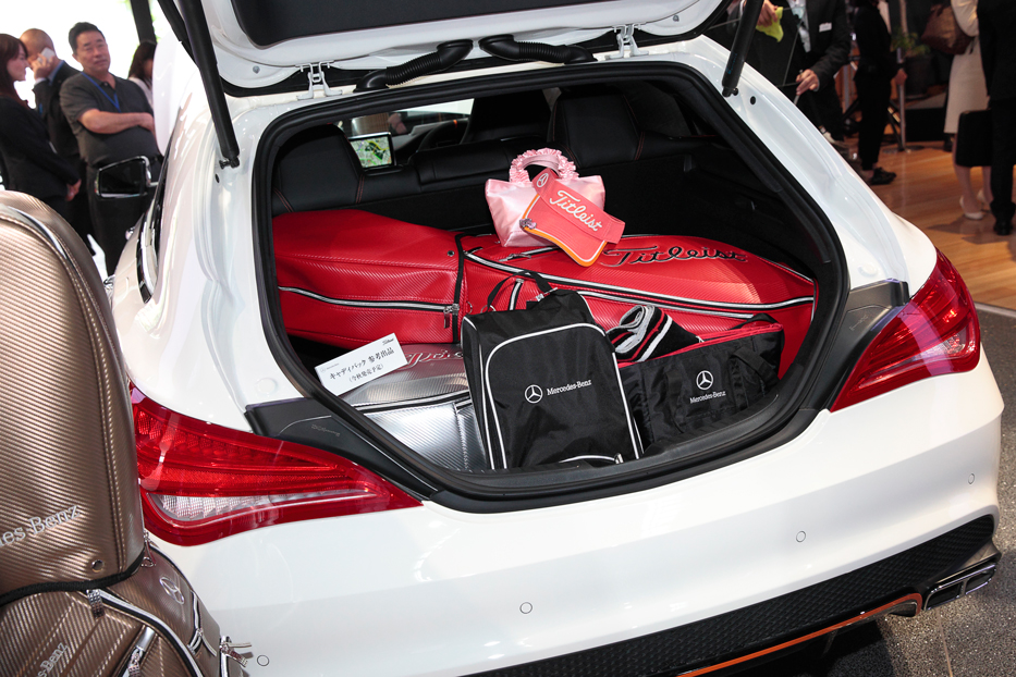 CLAシューティングブレークは、狩りに使う銃や少々の弾薬を積むために必要最小限の荷室を備えた、本来の意味でのシューティングブレークとは異なり、495リッター(VDA法)という荷室容量を誇ります。さらに、可倒式のリアシートを畳むと、最大1354リッターまで広がります。会場には、495リッター分のペットボトルがディスプレイされ、横に立つモデルさんと一緒に会場の注目を集めていました。