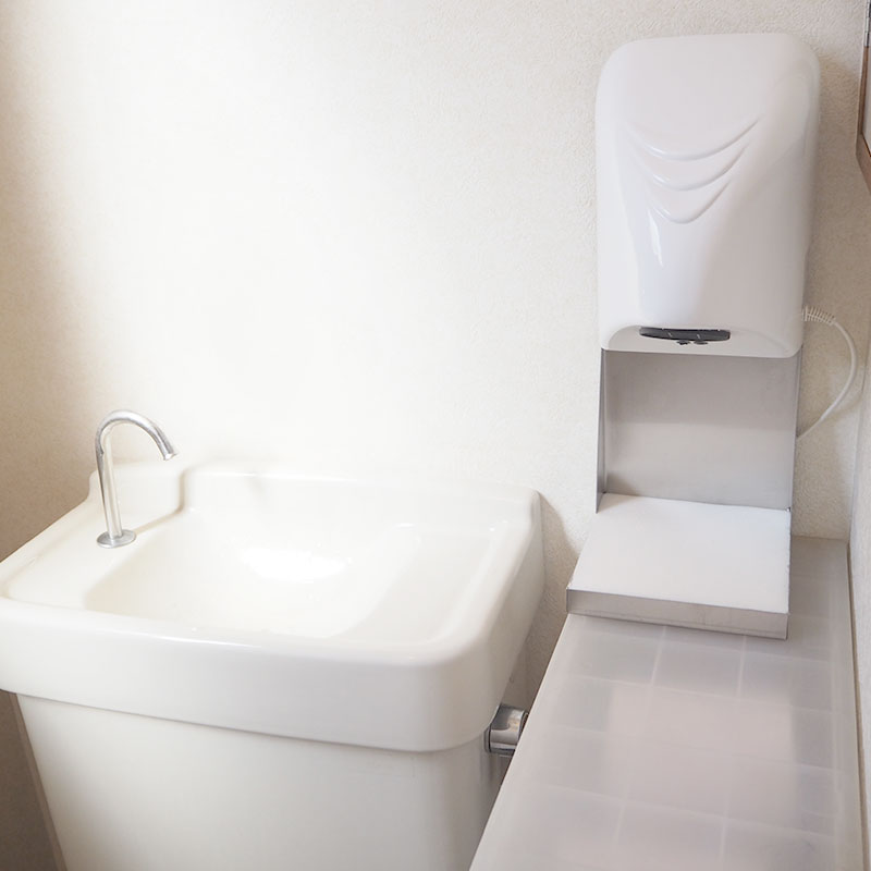でも、「置くだけ温風ハンドドライヤー」はスタンド式。その名の通り、置いてコンセントをさすだけ、工事不要です。しかも、コンパクトなので洗面所やキッチンだけでなくトイレにも設置できます。