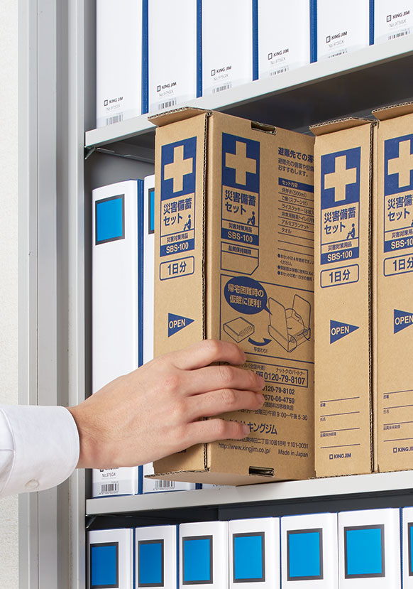 そこで便利なのがキングジムより発売される、A4ファイルサイズのスマートなパッケージの防災セット。書棚やデスクにスッキリ収納でき、いざという時にすばやく取り出せます。