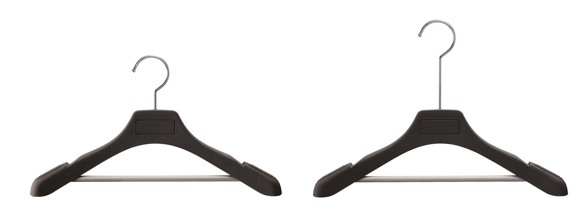 「収納効率ハンガー」は、ハンガーフックの長さが8cmの「ロングタイプ」(1本300円)と、2cmの「通常タイプ」(1本300円)の2種類。この長さの違う2種類のハンガーを交互に使うことで、かさばりがちな洋服の肩の位置をずらし、クローゼットの空間を有効活用しようという商品だ。