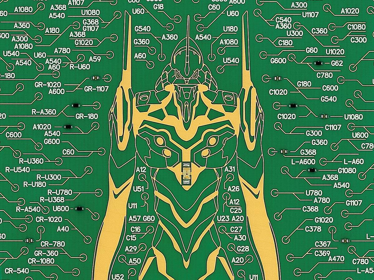 これまでも電車の路線図などを配線パターンにした基盤ケースをつくってきましたが、今回のエヴァンゲリオンのケースでは回路内のLEDが光る仕組みが付加されました。