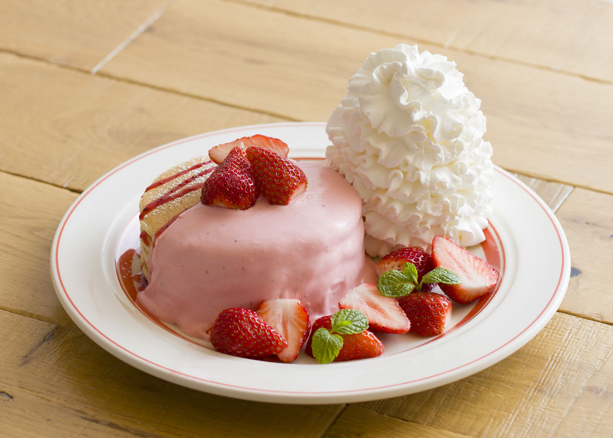 甘酸っぱいイチゴとチーズを組み合わせたストロベリーチーズクリームをたっぷりかけたパンケーキです。ピンク色のクリームと、周りを飾る旬のフレッシュなイチゴがなんともかわいらしいですね! 新鮮なイチゴとコクのあるクリームのマッチングはもはやテッパンのおいしさです!