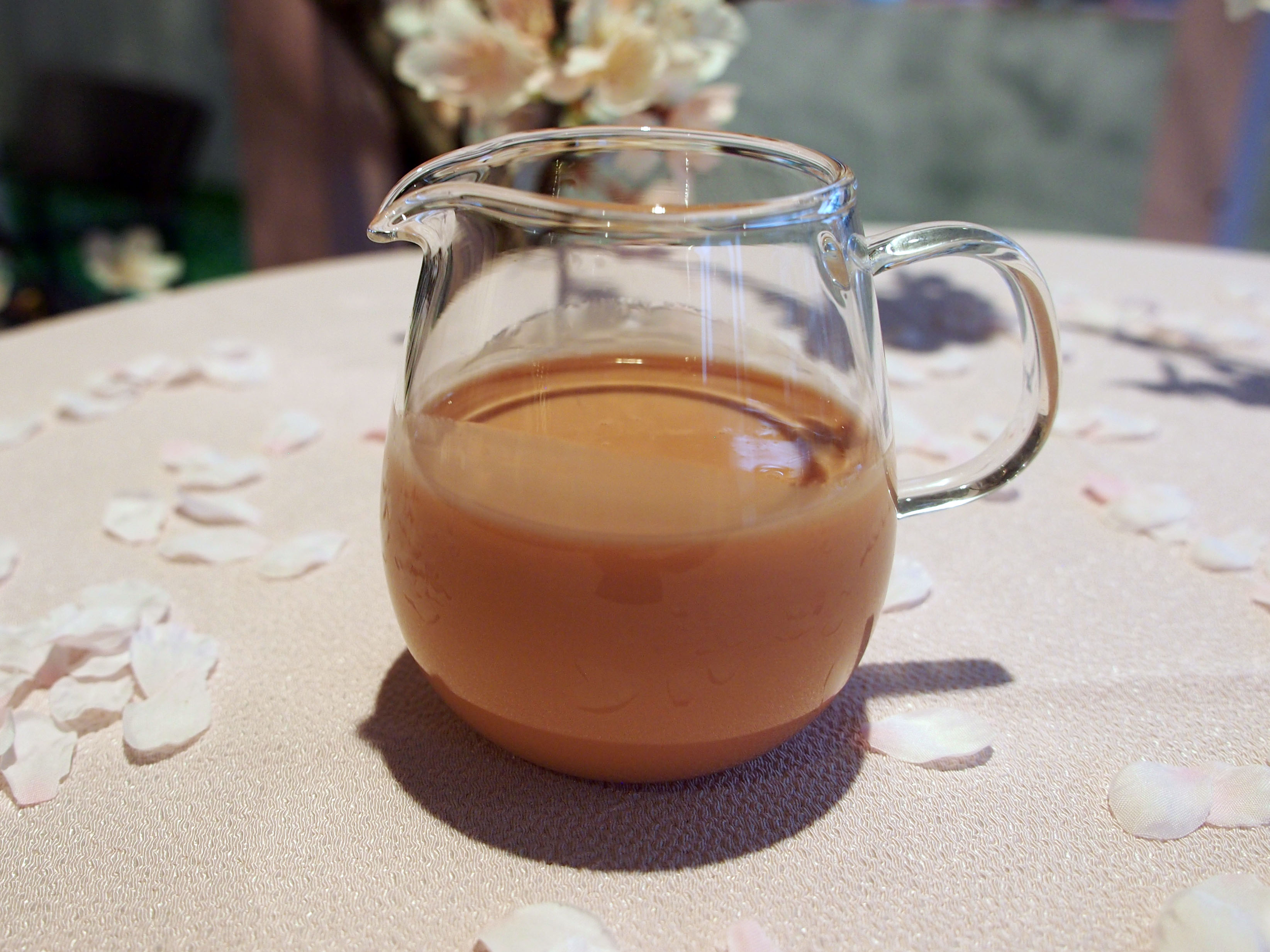 ▲練乳、桜の花びら、塩漬けの桜の葉を使用したソース。隠し味の白餡が味にコクと奥行きを出しています。