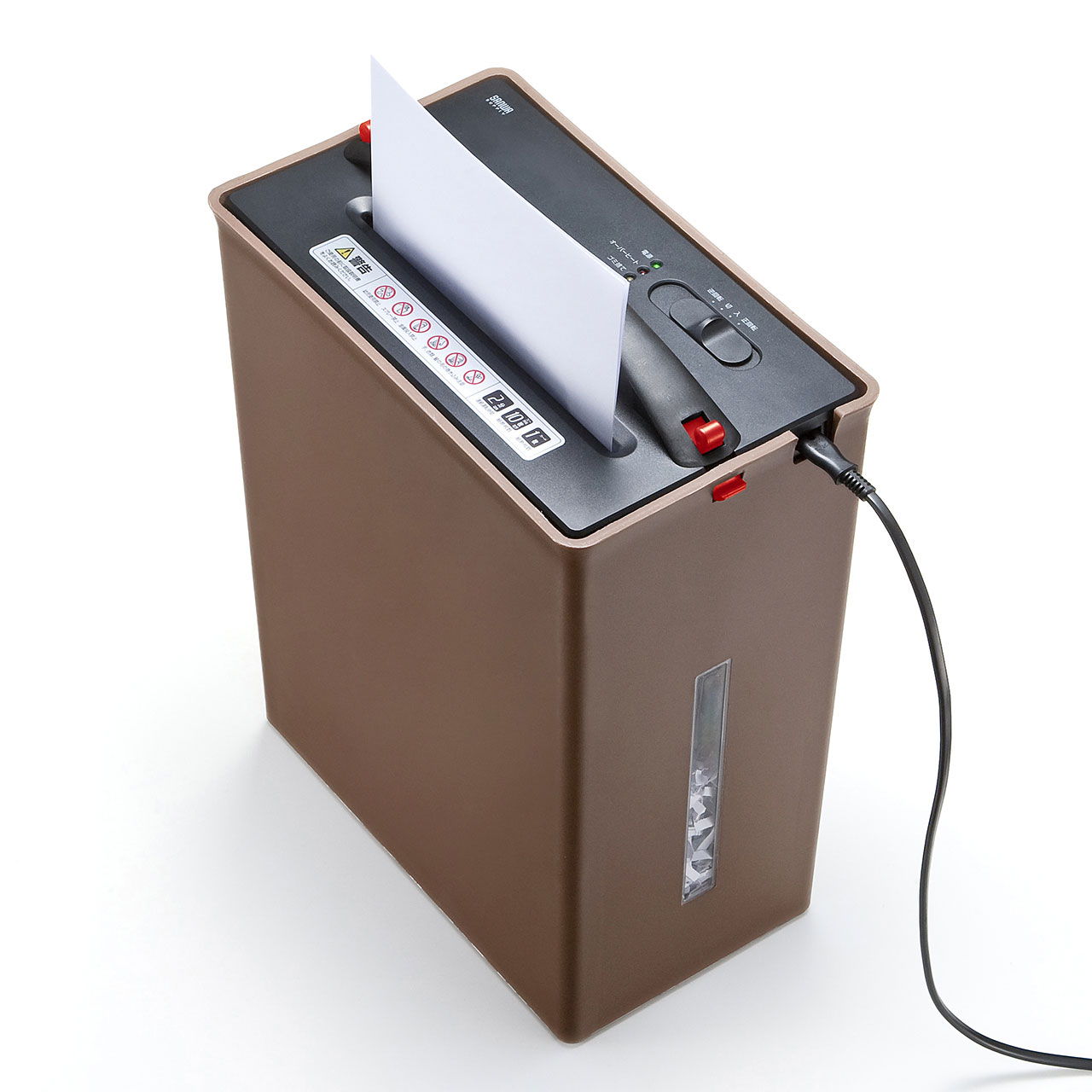 投入口に紙が投入されると自動的に細断し、終了すると自動的に停止する「オートスタート&ストップモード機能」を搭載。一度にA4コピー用紙10枚まで同時に細断でき、またクレジットカードなどの各種カードの細断も可能です。細断形状は5×43mmのクロスカットで、セキュリティも高レベルです。
