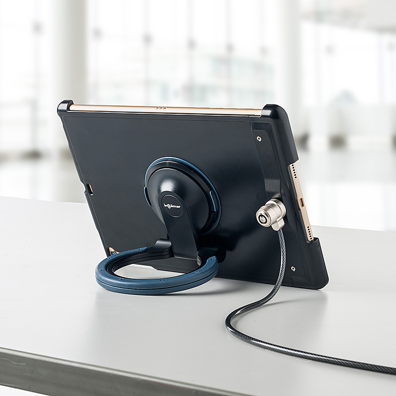 嬉しいのは、落下や傷からだけでなく、盗難からも守ってくれるところ。セキュリティスロットがついており、別途用意したワイヤーで括り付けることが可能です。ビジネスで店頭やイベント展示会用に使えるほか、プライベートでもカフェで使いながらちょっと席を外したいとき、出先で置き忘れを防ぎたいときなどに役立ちそうですね。カバー本体はネジ留め式ですから、iPadだけ抜き取られる心配もありません。