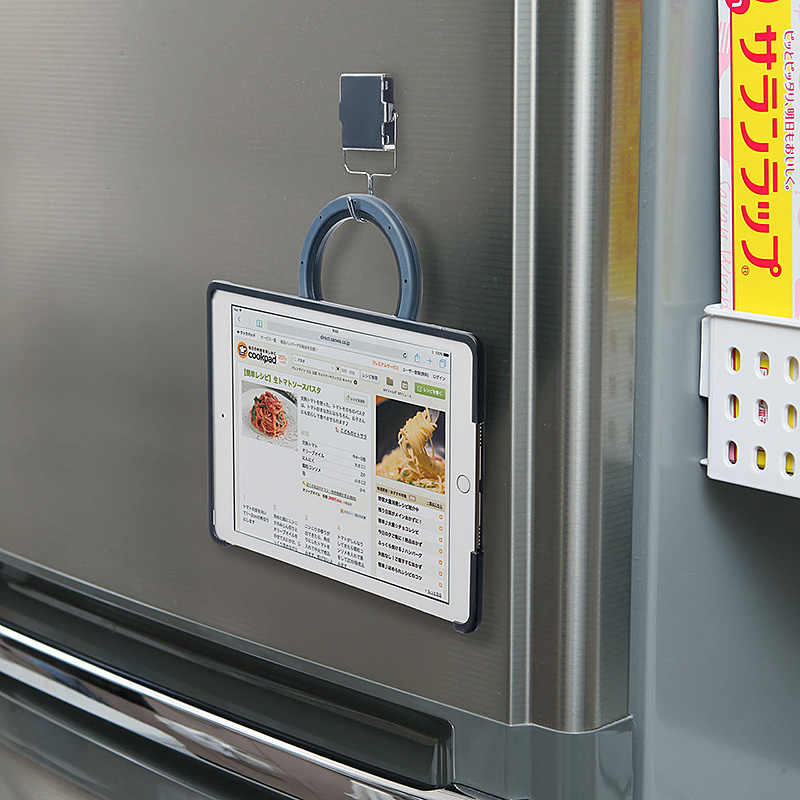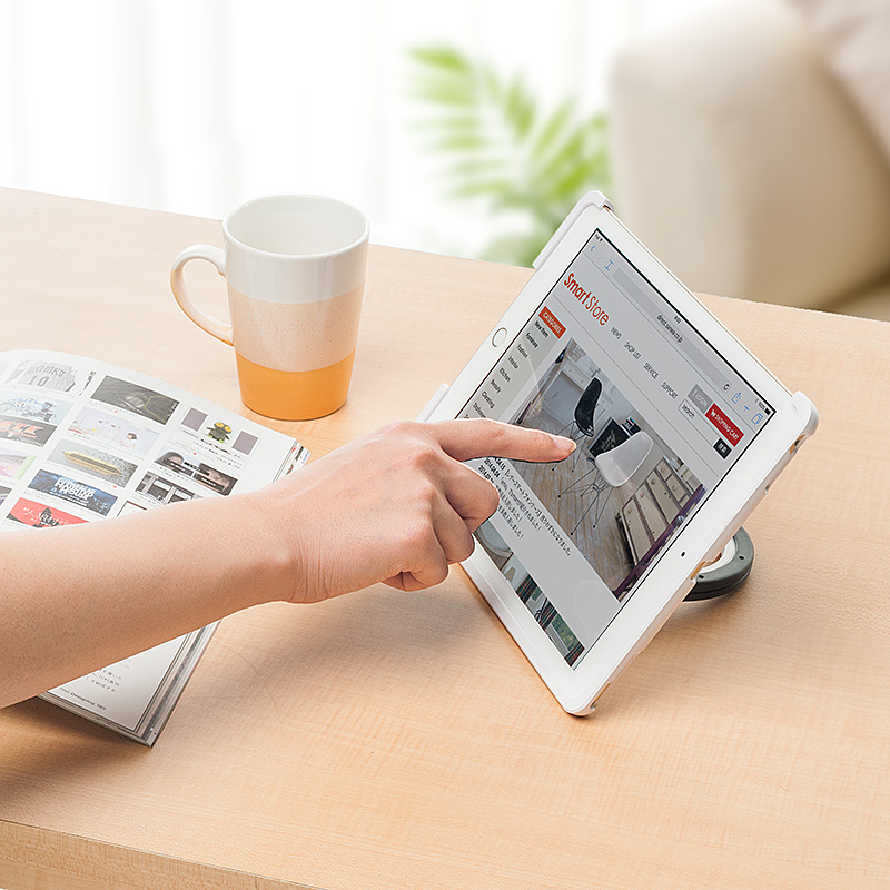 サンワダイレクトから登場したのはiPad専用セキュリティスタンド「200-SL043」シリーズ。対応機種は9.7インチiPad Pro、iPad Air 2、iPad Air。純正のSmartCoverを装着したまま本体を収め、保護できるカバーです。背面にはスタンド用の輪っかがついており、画面の角度調整のほか、縦置き・横置きが可能。iPadを見ながら料理したり、動画視聴したりするときに便利です。