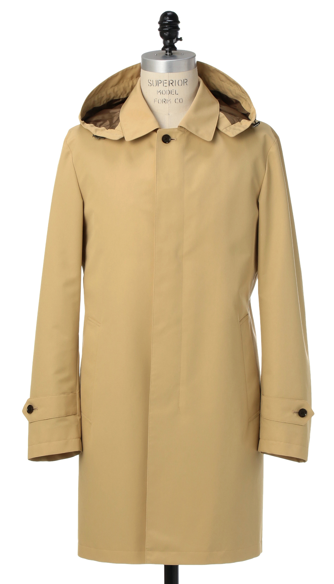 レインコートは雨水から衣服を守るために着用するものですが、長く雨に当たっていると、どうしても少量の水が侵入してきます。「アンブレラコート」は、素材に国内有数の合繊異物メーカーの高密度ポリエステルを使用。特殊な縮れ形状の糸を高密度に織り込むことで、優れた撥水性と耐水性を実現しています。また、縫製糸にも撥水加工を施しているので、耐漏水性も高いのが特徴です。日本洋傘振興協議会(JUPA)の雨傘における耐漏水性準用試験の結果、コート内部への漏水がないことが確認されています。また、取り外し可能なフードが付属しているので、突然の雨でも安心です。