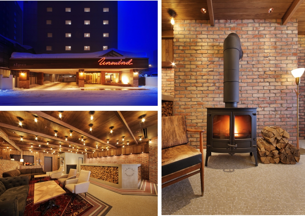 ホテルアンワインドでは、「火」「木」「レンガ」「アンティーク」の4つの要素を中心にロッジの世界観を創出。ダブルルーム、 ツインルーム、 4名利用可能なファミリースイートの3タイプで、全室25㎡以上とゆったり! しかもホテルでは珍しいバス・トイレ別設計なので、自宅のようにくつろげる。また、ファミリースイートはキッチン付きで、北海道の食材を買ってきて料理を楽しむこともできる。