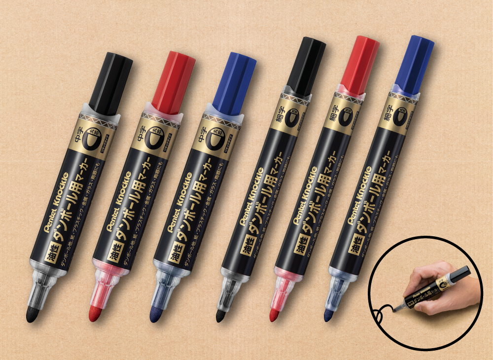 ダンボールへ書く際の、文字のかすれを防ぐ工夫をこらした「ダンボール用マーカー」。ラインナップは、丸芯中字の黒、赤、青と、丸芯細字の黒、赤、青の6種。