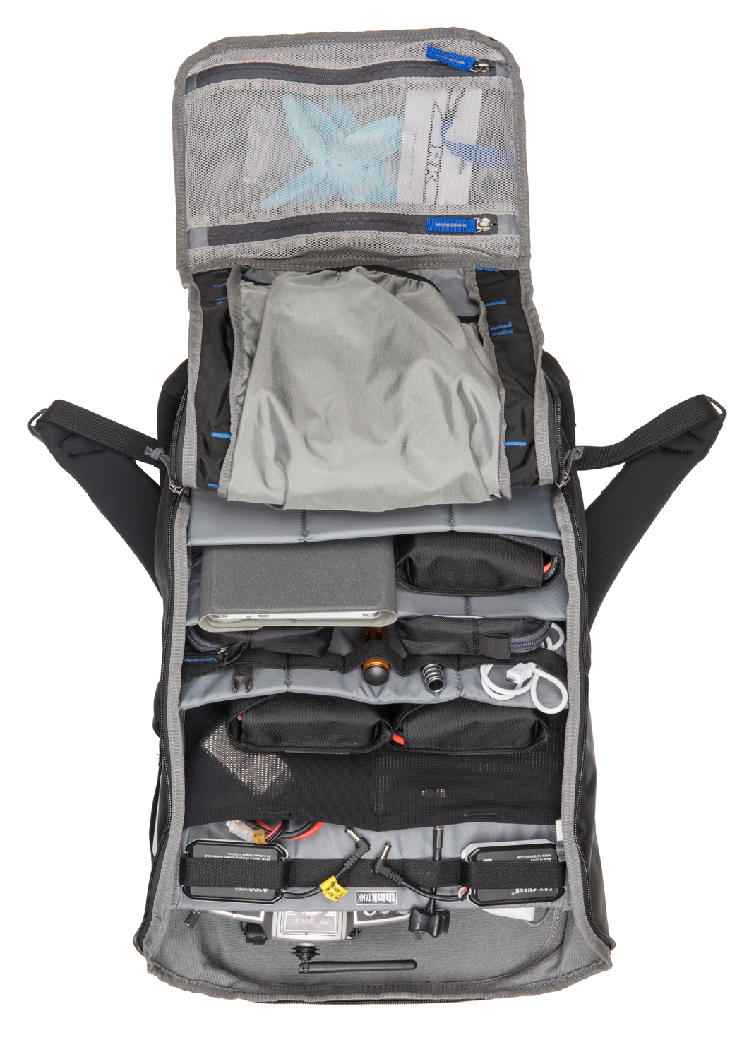 メインコンパートメント部は仕切りが棚のように設けられ、ドローン本体や、ラジオトランスミッター、ゴーグルなどをきれいに分けて収納可能。