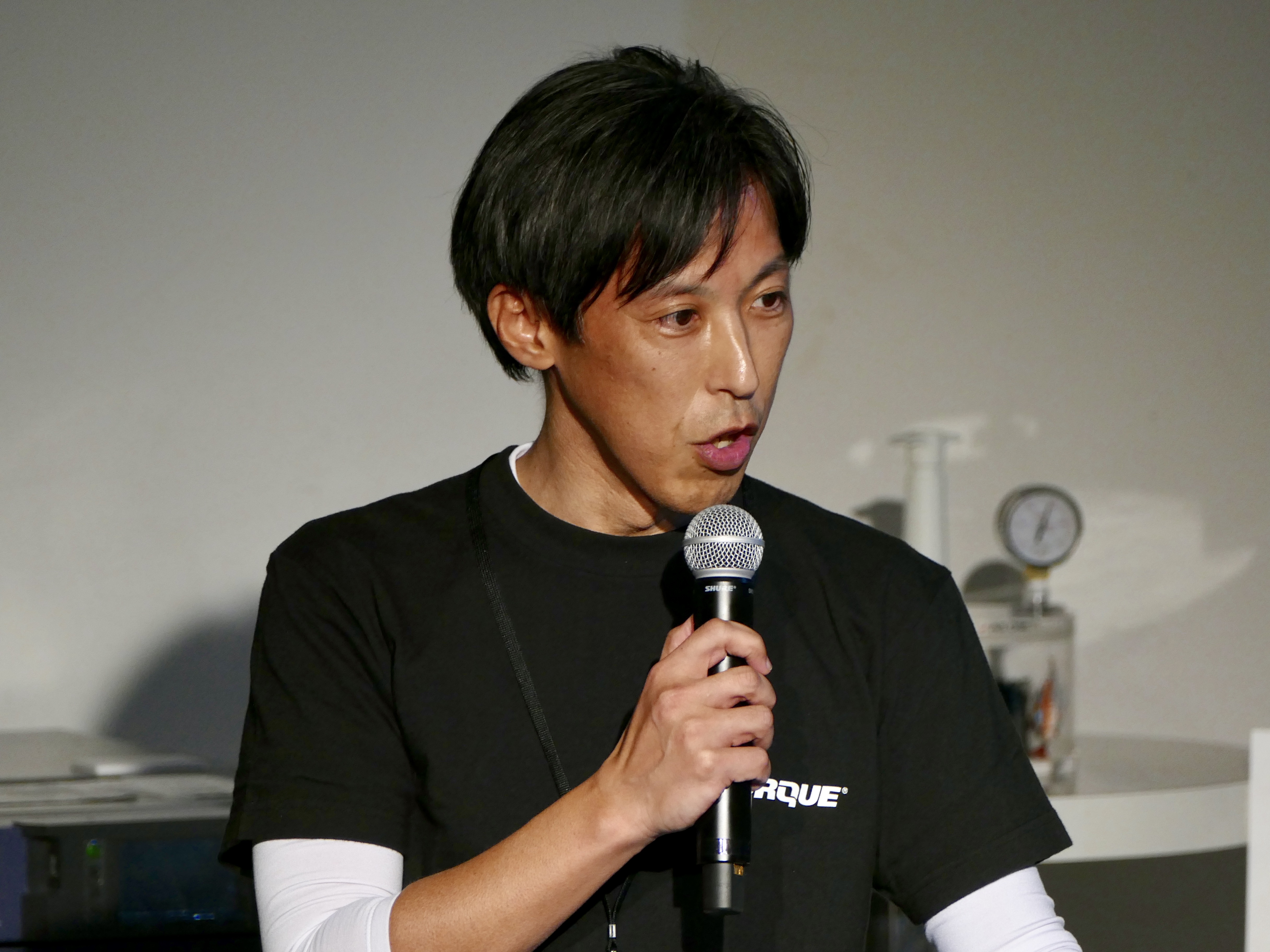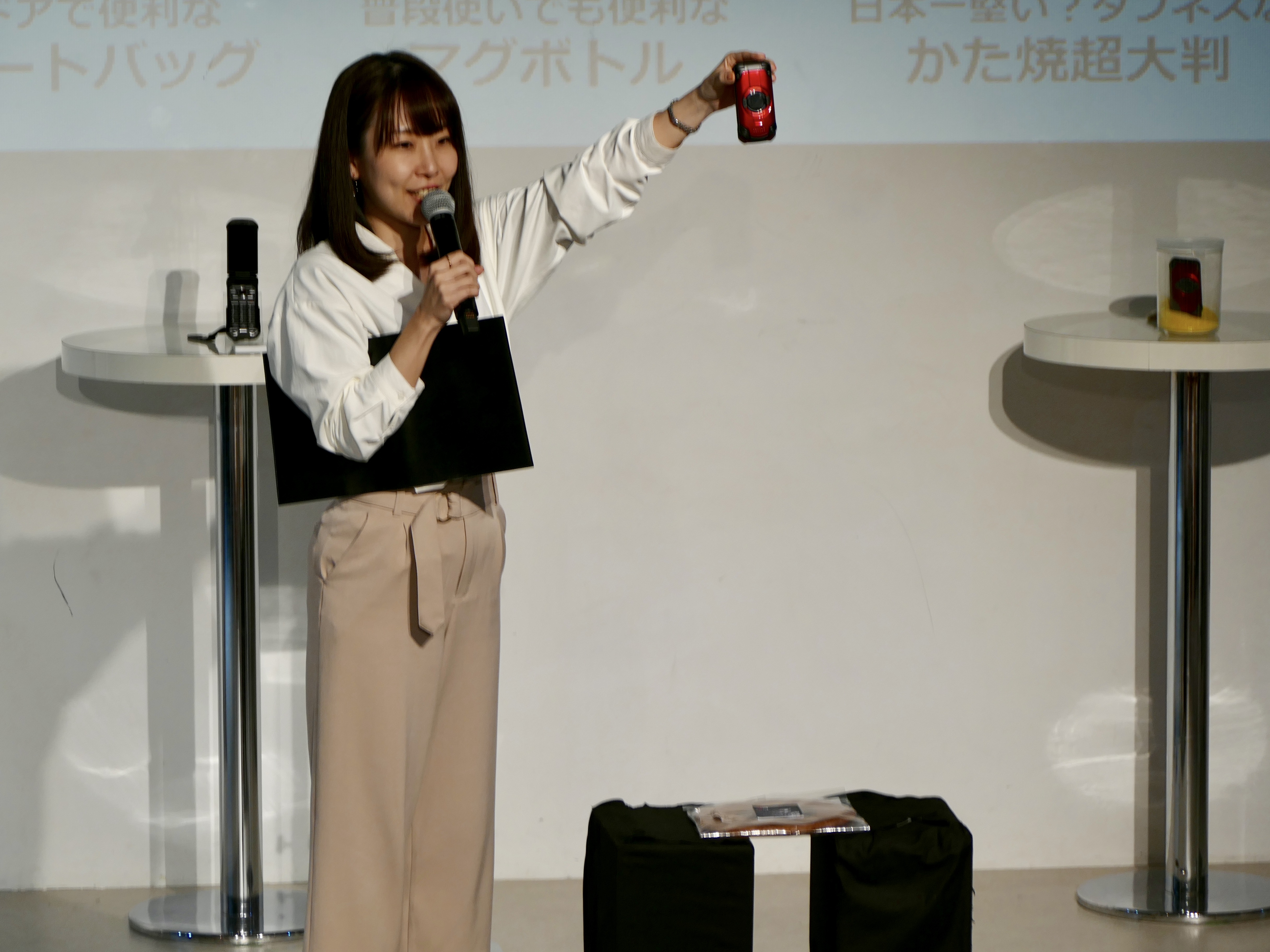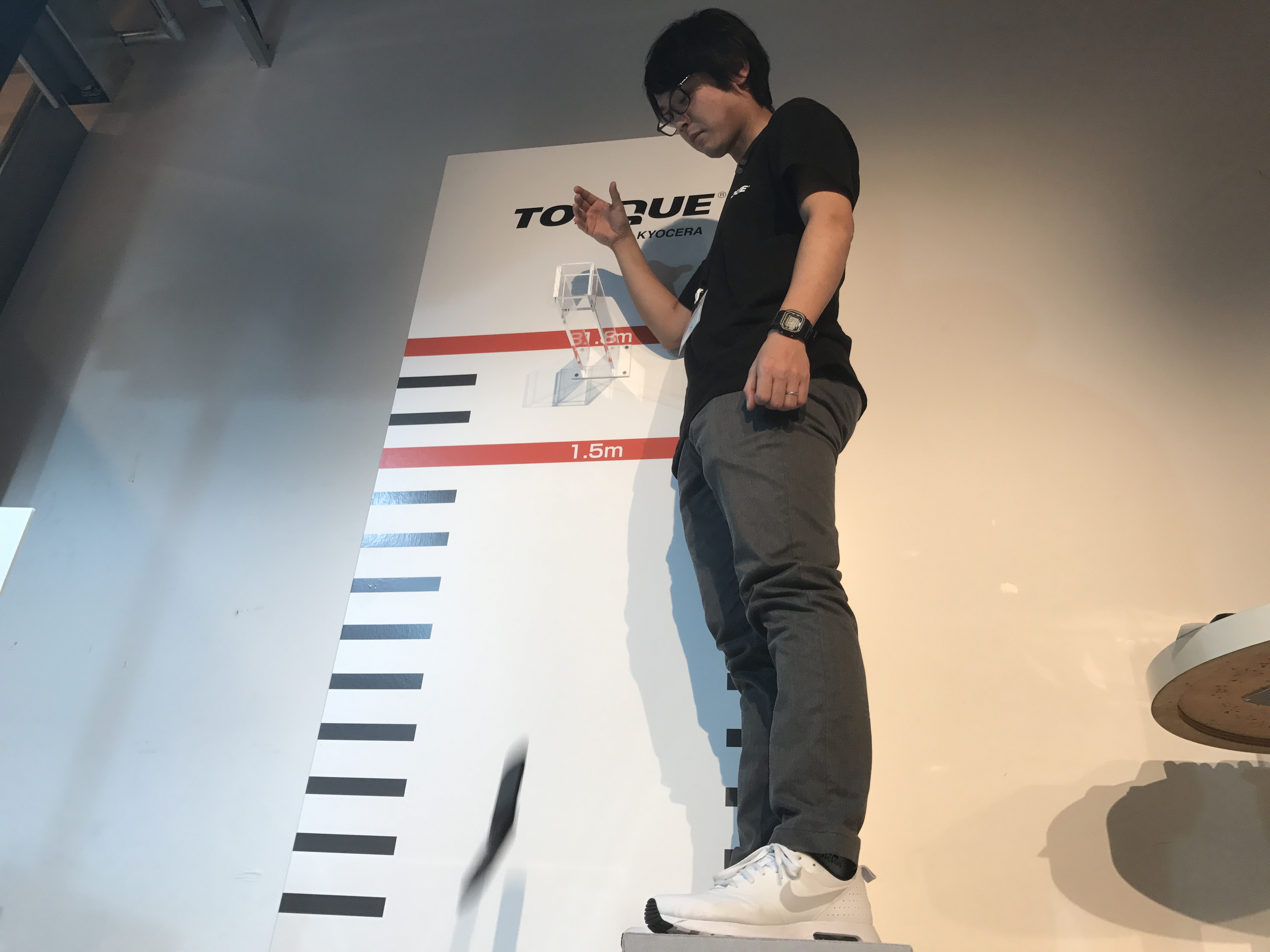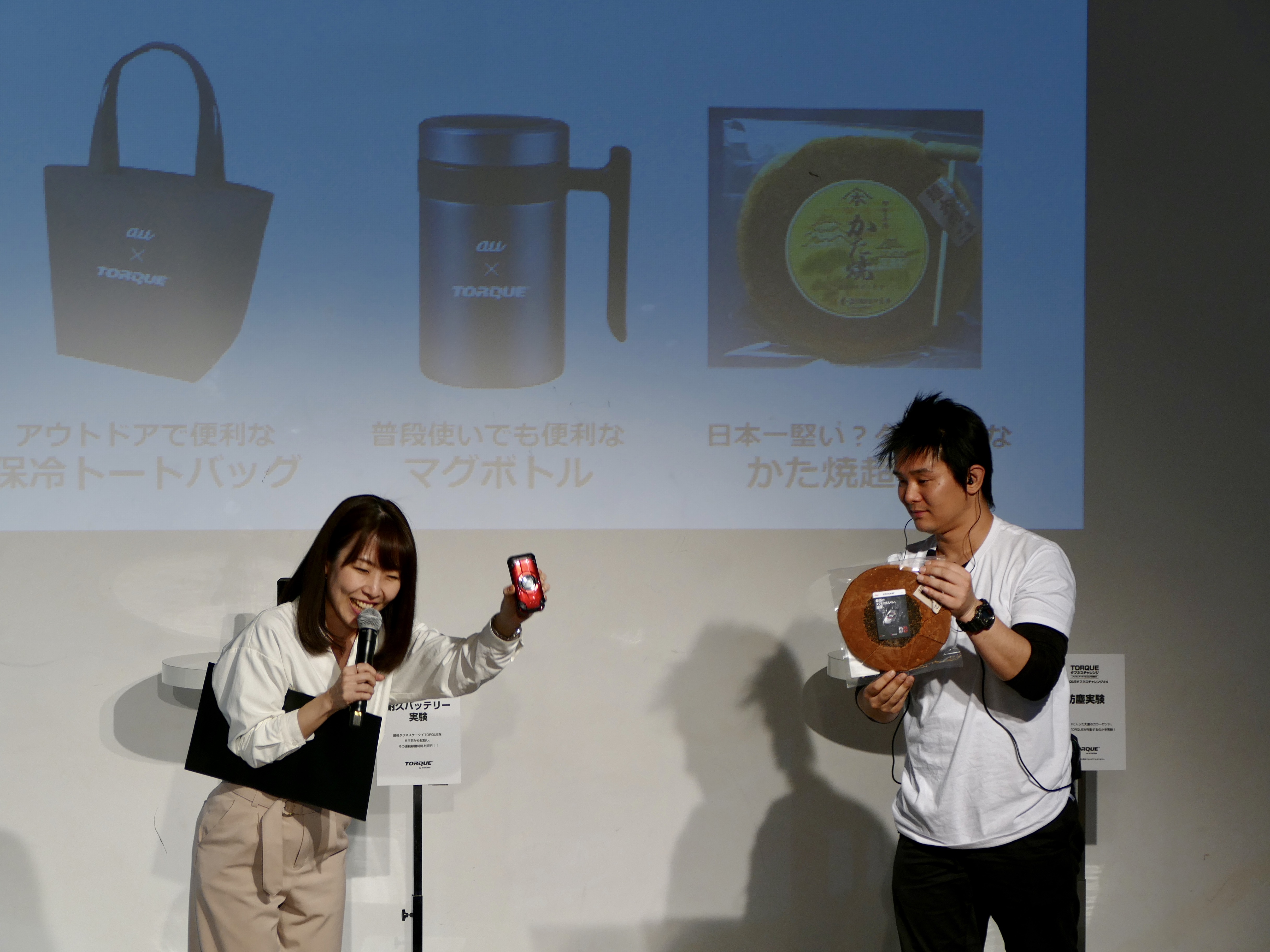 イベントの締めは、お土産の「かた焼き大判」と一本勝負! 日本一の硬さを誇る大判せんべいの上に、TORQUEを落下させました。