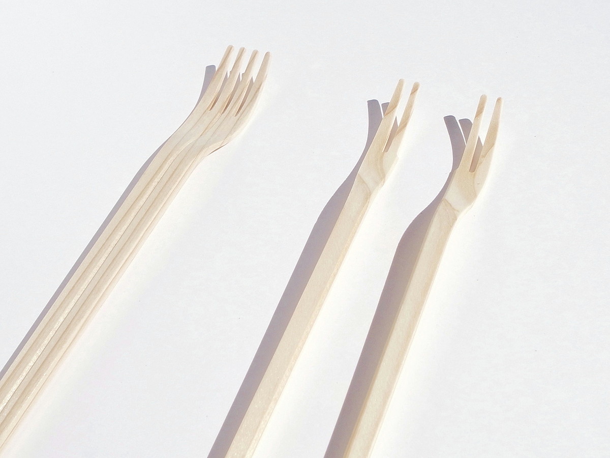 フォークの形をした割り箸です。同じ食事でも、習慣によって使うカトラリーは異なりますが、このアイテムひとつあれば、どちらの人も満足ですね! 食事によってカトラリーを複数用意する必要がなく、エコロジーの観点から見ても優れたアイデアといえます。