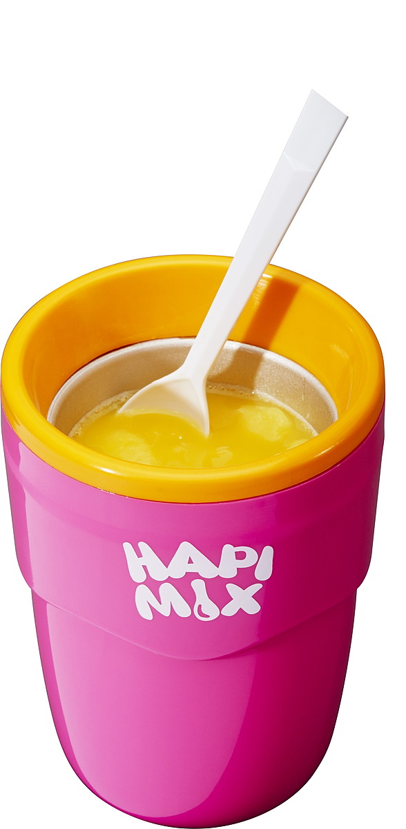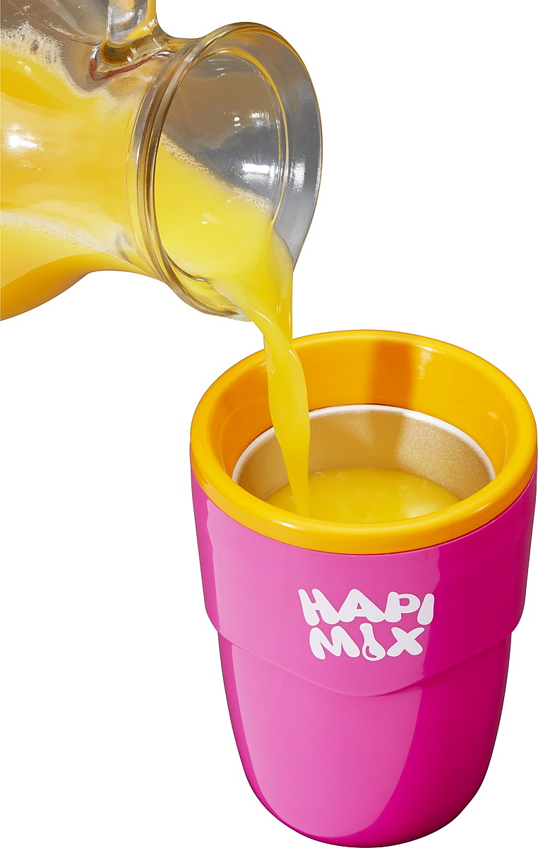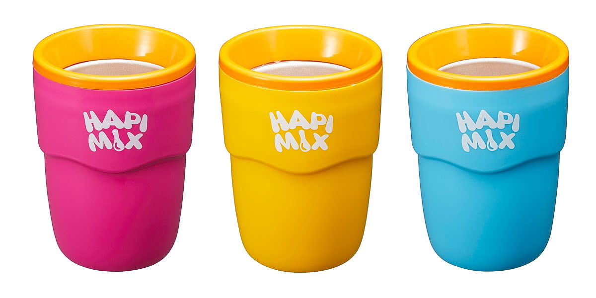 「HAPI MIX」を冷凍庫にスタンバイさせておけば、ジュースを注ぐだけで手軽にフローズンドリンクが作れるのだ!