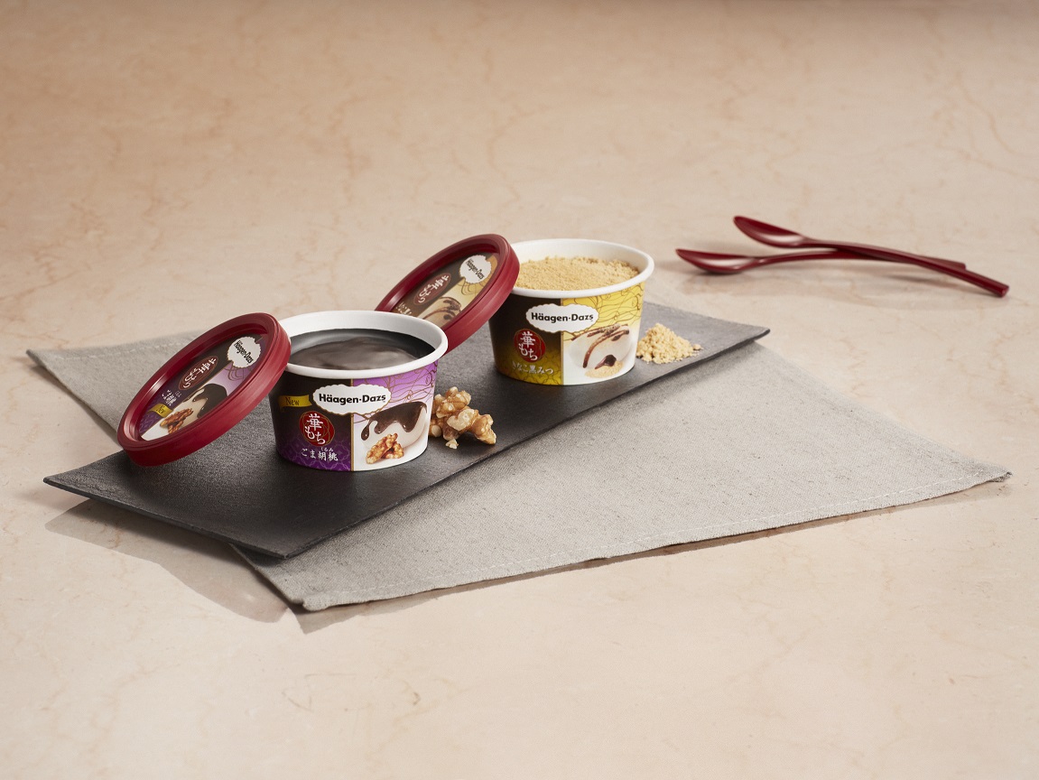 ラインナップは、おなじみの「ハーゲンダッツ ミニカップ 華もち きなこ黒みつ」と、新作「ハーゲンダッツ ミニカップ 華もち ごま胡桃」。ごまと胡桃とお餅とアイスのコラボ!? そんなのおいしいに決まってる!