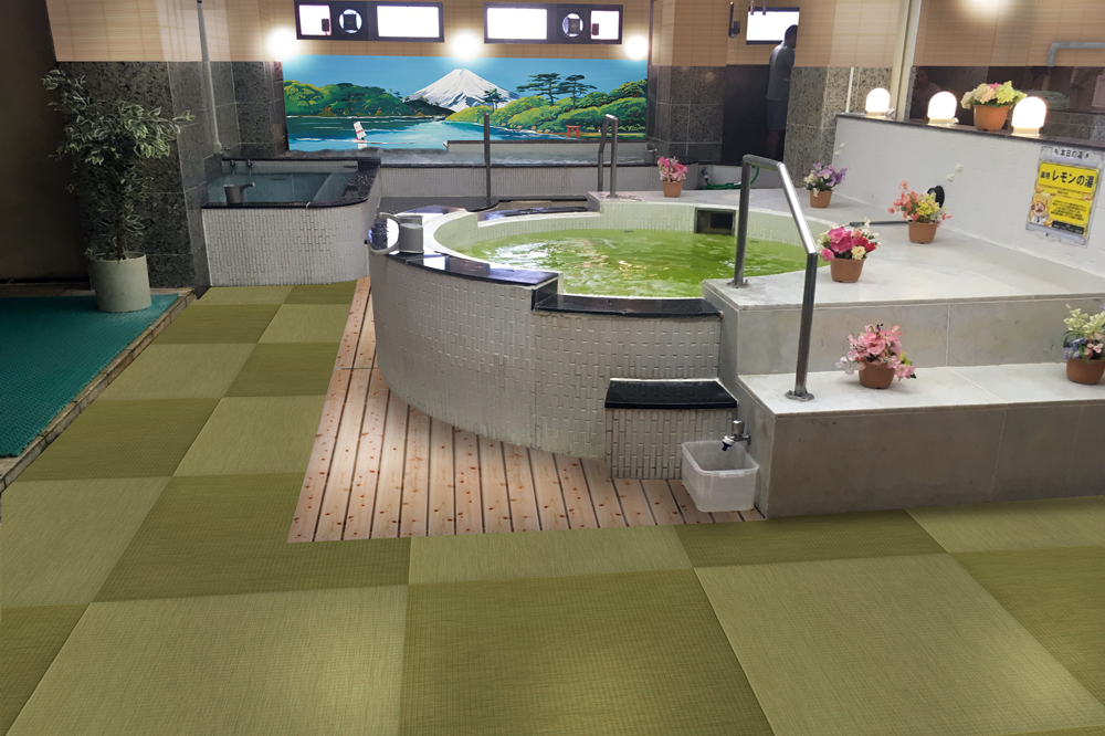 ご覧の通り、大浴場の床一面に、柔道場よろしく“畳”を敷き詰めてしまうという思い切りの良さ。誤った日本観が加速しそうな心配もありますが、単に日本らしさの演出のみならず、万一の転倒の際にもケガしにくいようにといった配慮でもあるとのこと。大浴場に慣れない訪日外国人の目には新鮮に、また日本人にとっても壁絵の富士山と相まって意外と落ち着く空間になるかもしれません。