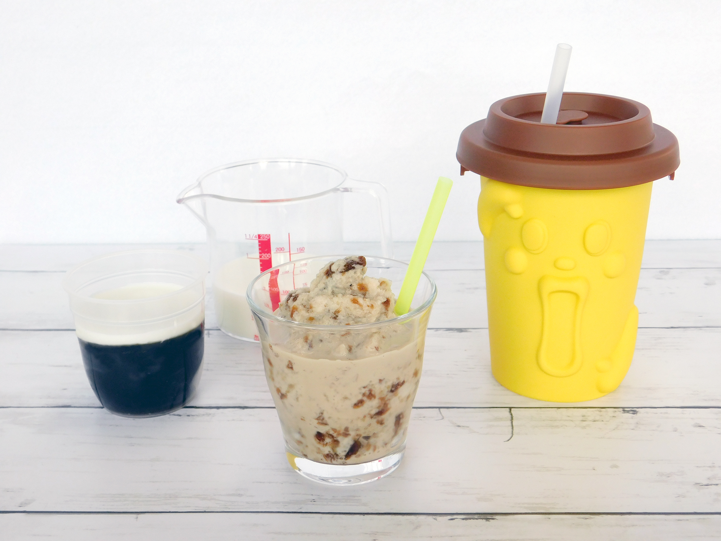 1.市販の「カップデザート」を本体に入れ、もんで潰して冷凍庫で約5時間凍らせます。