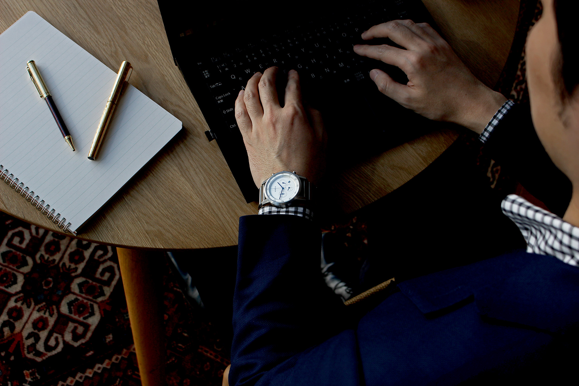 文字盤にブラスト仕上げが施され、金属の質感を引き出しています。外周リングに時刻を示す12本のスリットが配され、リング天面には繊細なフォントのアラビア数字を60秒表示でレイアウト。さわやかなホワイトカラーとシンプルなデザインはファッション性も高く、オンオフ問わず使用できるデザインとなっています。