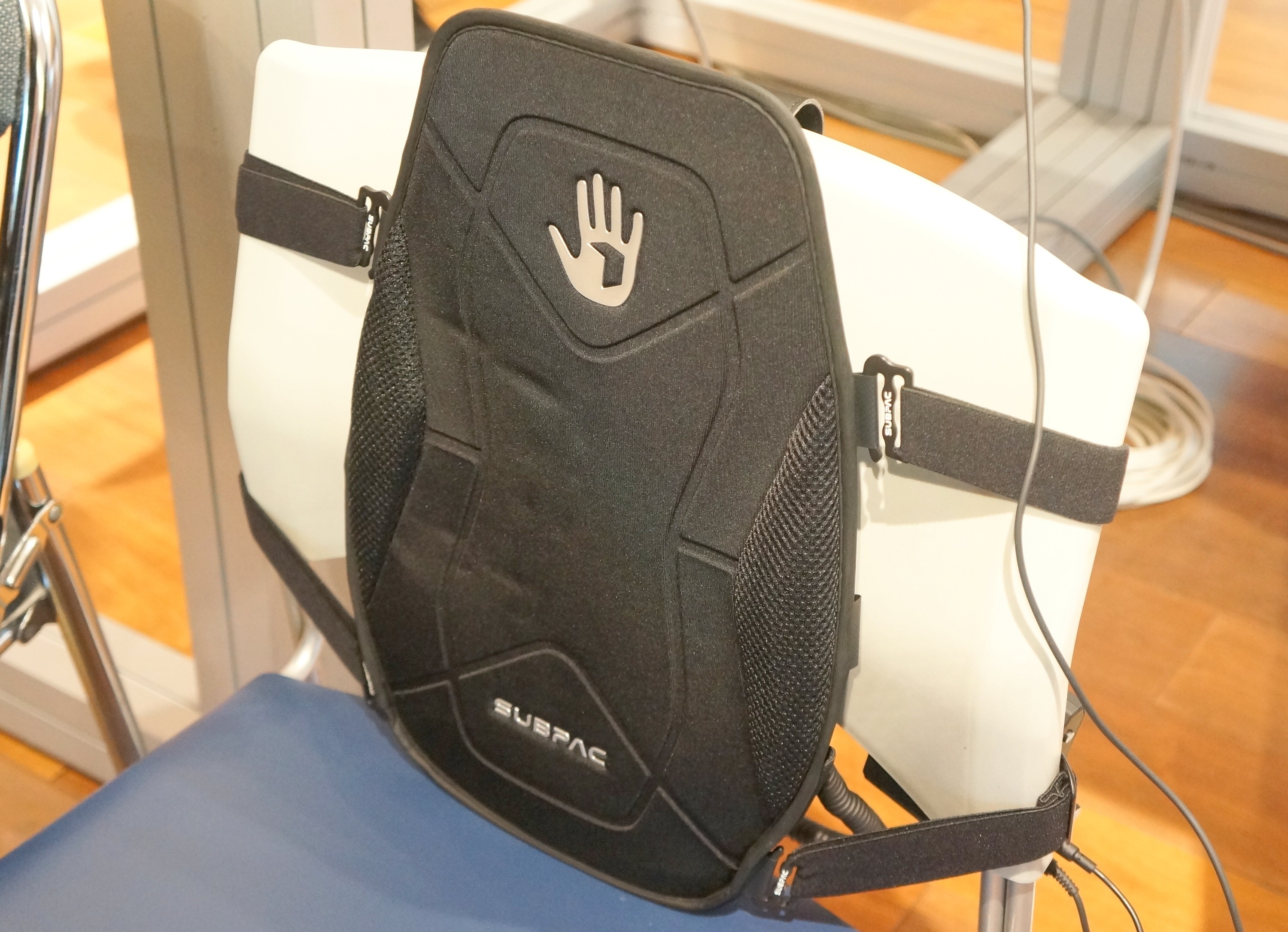 ▲「SUBPAC S2」をバックパックから取り出して、イスやシートに取り付けることもできる