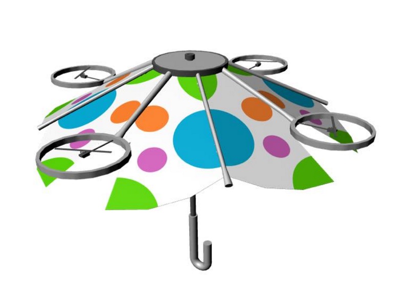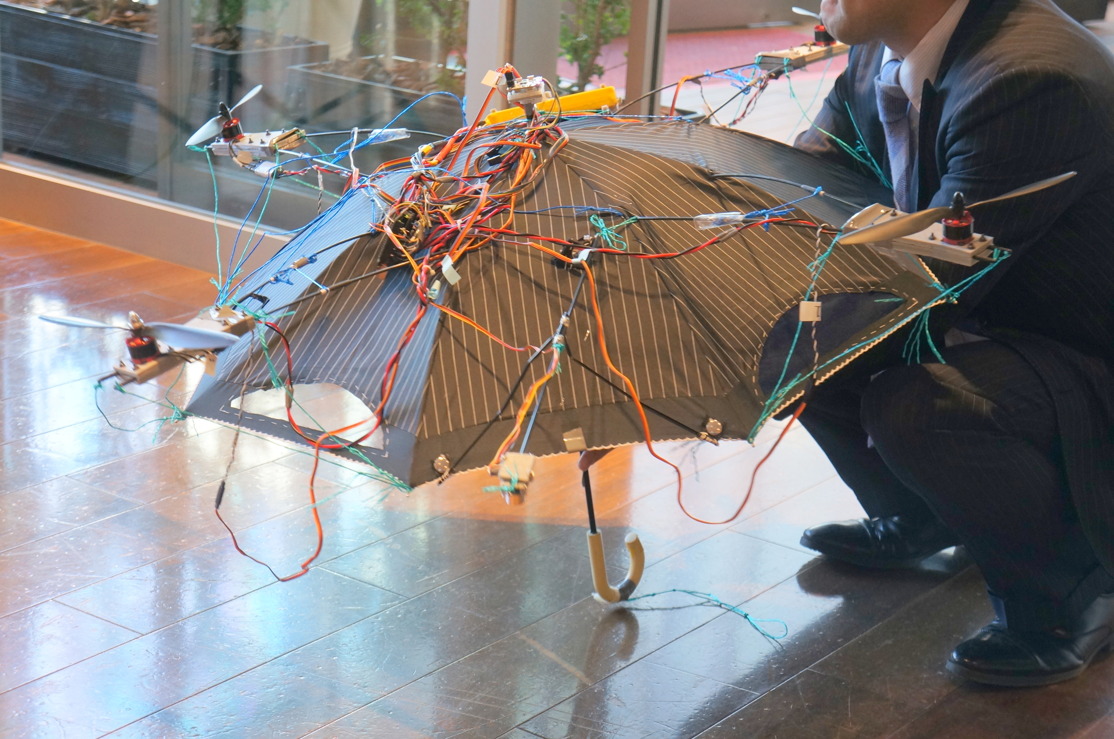 「free Parasol」は、傘の“ハンズフリー化”を目指した製品。持ち手部分のスイッチを押すと、本体に搭載された4つのプロペラが起動し、本体を浮かせられます。コントロールスイッチを押せば、進行方向に合わせて傘を移動することも可能。